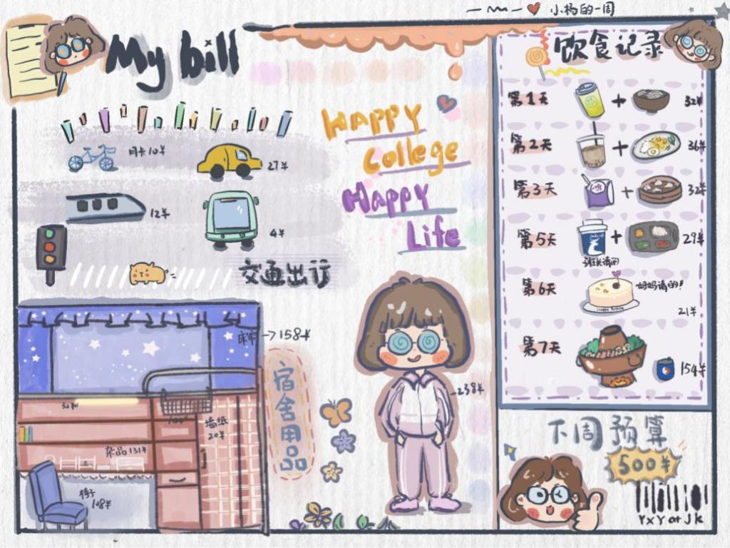 新生入学初期,由原来的“被约束”状态过渡到大学期间的“自我管理”状态,很容易在财务问题上“青黄不接”。为了让大家在开学初期养成记录生活开销的良好习惯,合理规划开销用度,避免因过度消费产生的安全隐患,我院于2020年10月举办“用画笔记录生活 以数据凝练人生”手绘账单征集活动,旨在倡导学生养成勤于记账的好习惯,树立健康向上的消费观。同时结合专业特长,将良好生活习惯传递给更多同学,丰富校园生活,营造勤俭节约的校风院风。