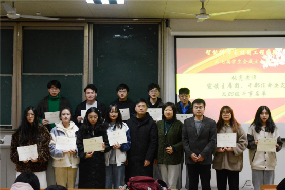 首先由张亮老师宣读第七届学生会主席团、干部任命决定和干事名单。接着戴书记为学生会成员颁发聘书并合影留念。然后主席团代表徐耀发表演讲,向全体学生会成员提出了三点建议并承诺秉着公平公正的原则全心全意服务全体同学。干部代表唐嘉伟的发言则根据自己的经历给干事们提供了宝贵的经验。新生代表杨鑫艳代表全体20级干事表态发言。最后戴典芬书记总结了我院取得的各种成绩,并代表智控学院向大家表示感谢,同时也向全体学生会成员提出了爱学习,做表率的要求,鼓励大家要把为同学服务作为一件快乐的事情来对待。