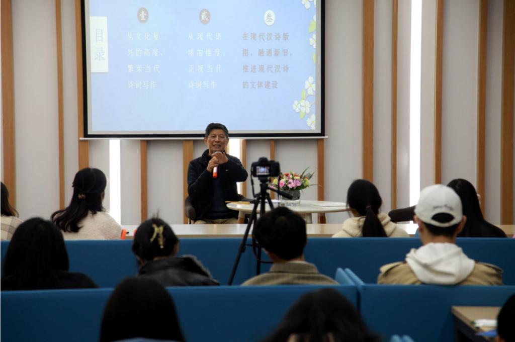 活动伊始,子川老师为我们详细地介绍了他与汉诗的邂逅和相知,详释了新诗和旧诗的重要性和它们之间的“爱恨情仇”,以及他本人为汉诗文化的传播做出的重要贡献。随后,子川先生从三个不同的角度,介绍了汉诗的传承与创新,指出我们不仅要从文化复兴的高度,去繁荣当代诗词写作;也要从现代语境的维度,正视当代诗词写作;在现代汉诗版图上,融通新旧,推进现代汉诗的文体建设。