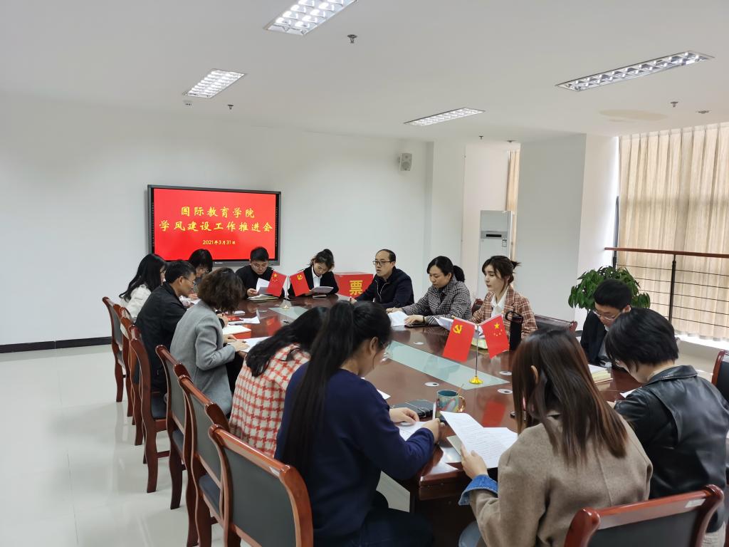 国际教育学院高度重视学风建设,针对学院学风问题实施系列措施以提升中外合作办学人才培养质量。开学第三周,新学期线下授课伊始,学院安排了教学管理办公室与学工办公室的老师与辅导员每天进教室进课堂抽样调查学生上课情况,督促学生做到“五不三带”。3月31日下午,学院召开学风建设工作推进会,分析当前学院存在的学风问题,探讨建立学风建设长效机制,国际教育学院党总支(部)书记沈奇、院长李响、副书记郑庆秋、副院长孟超以及全体老师和班主任参加了会议。