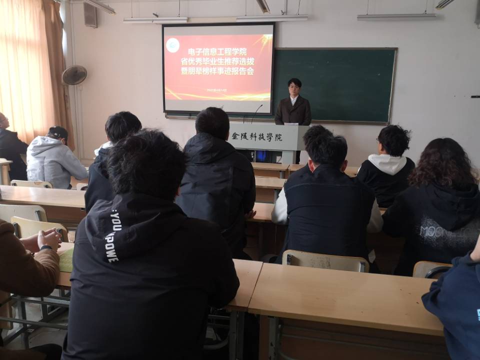 4月14日,电子信息工程学院在江宁校区2311教室举办省级优秀毕业生推荐选拔暨朋辈榜样事迹报告会,辅导员邹文荣、李岩,参与评选的毕业班同学,19级和20级的学生代表参加了报告会。