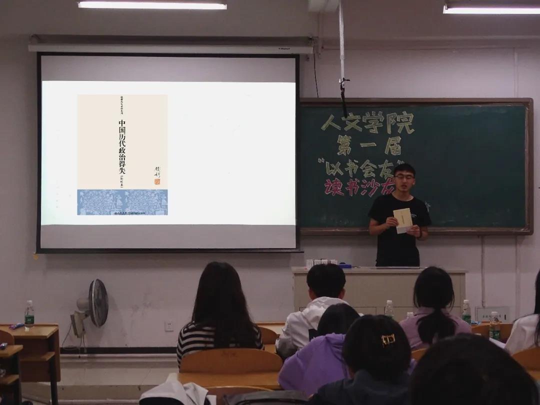 本次活动书目均有由学院教授推荐,如《中国历代政治得失》、《鲁迅自选集》、《金陵物语》等经典文学作品。同学们在规定书目推荐环节,争相推介,分享读书感悟。“钱穆先生的《中国历代政治得失》以十万字讲透了2000年中国政治制度,既讲革新又讲传承,用‘取精去糟’的手法为我们掰开封建制度的巨石。”来自19汉语国际教育(2)班的杨成龙同学分享了读此书的意义和方法。在自由分享环节,同学们纷纷交流起自己的日常读物,如《万历十五年》、《活着》、《大秦帝国》等作品。同学们分组发言讨论,分享了在阅读中的喜悦和乐趣、收获与成长。来自20古典文献(古籍修复)班侯闯同学说:“《活着》里的福贵,最后只能在老黄牛旁边感慨自己苦命的一生。人生,就是一边失去,一边成长。只有经历地狱般的磨砺,才能荣辱不惊;只有与过去握手言和,才能活得潇洒自如。”