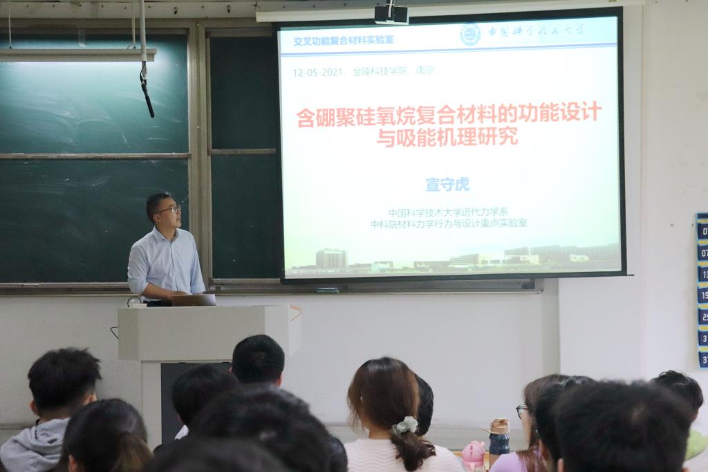 宣守虎教授就“含硼聚硅氧烷复合材料的功能设计与吸能机理研究”这个课题展开阐述,分别介绍了STG的含义和缓冲耗能机理,调控STG的力学性能的方法,STG复合防护材料的结构设计和防护材料的智能化设计与应用,把专业知识融入生活实例中,把晦涩难懂的专业词汇变得通俗易懂,帮助同学开阔了专业眼界,对材料专业未来的发展和就业前景有了更深的了解。