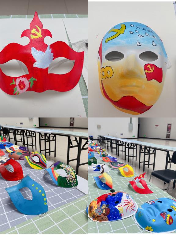 活动前期,购买面具和绘画材料,并且通过线上征集初稿,筛选优秀作品的形式,确定参加活动人员;活动过程中,老师和同学们自选喜欢的面具款式,现场创作,大家用画笔书写故事,用面具表达心情,尽情发挥自己的绘画天赋,宛如参加一场“绘画盛宴”。其中不乏主题鲜明,意蕴丰富的优秀作品,饶洁、邢宇菲、刘雯倩等同学的面具绘画富有艺术设计感,将家国情怀与艺术融于一体,用画笔形象地勾勒出了有志青年的拳拳报国之情,“以青春挥洒笔墨,以热血书写华章”。创作结束后,老师和同学们在面具背面写下了自己的心情。最后,活动主办方将优秀面具作品进行展览。