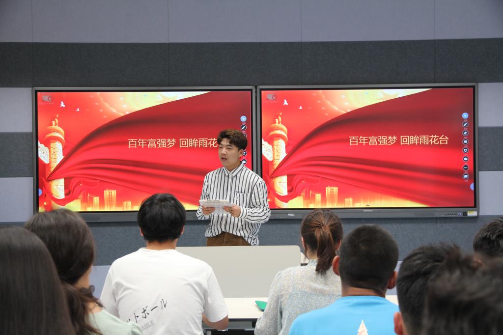 本次团课“讲师团”来自“第十一届全国大学生红色旅游创意策划大赛”学生团队,他们从不同角度和维度,分享了参赛过程中对党史学习的收获和感悟。19旅游管理的杜旭同学,从拍摄实践和精神视角,深入探究了南京长江大桥的红色精神,鼓励同学们接续前人的奋斗创新精神,贡献青春力量。20旅游管理的彭森同学,分享了以“宁听峥嵘岁月,探索红色脉搏”为主题,号召同学们学党史,强信念,在学习、实践和调查中树立正确的世界观、人生观和价值观。20旅游管理的高峰同学,讲述了雨花台精神中许包野烈士与“迎春花”的动人故事。国风浩荡,吾辈英豪,青年有志,国之栋梁;青年担当,国之希望;青年爱国,国将富强!现场同学们聆听了团课后,踊跃向三位主讲人提问,少数民族预科班同学刘若冰说:“听了学长学姐的分享,我的感受颇深,红色精神中不仅是一座桥,一个名字,更是我们这个民族绵延万万里的脊梁!我们是中华民族大家庭中的一员,如果我们每一个人都用‘浮舟沧海,立马昆仑’的精神去拼搏去奋斗,那么我想,中华民族的伟大复兴指日可待!”。