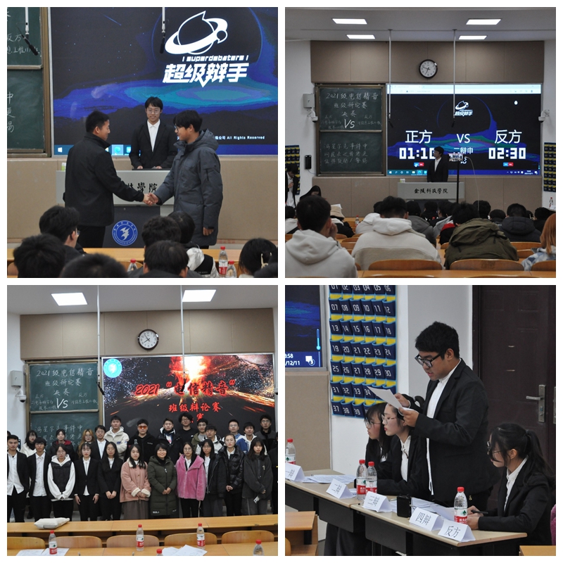 经过前期初赛的角逐,12月11日,电子信息工程学院在江宁校区8100教室举办了2021级“电信精音”班级辩论赛决赛,辅导员邹文荣老师,团总支学生会主席团,决赛双方代表队,部分学生代表参加了辩论赛,本次赛事邀请了校辩论队、往届优胜队队员代表任评委。