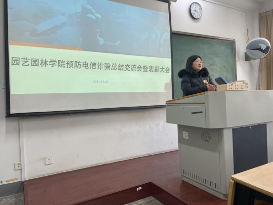 为了表彰同学们在预防电信诈骗方面的努力,进一步提高学生防范电信诈骗的意识,园艺园林学院于12月28日下午15:30在教学楼312举办预防电信诈骗总结交流会暨表彰大会,本次大会由园艺园林学院党委副书记甘黎明主持,校党委保卫处范小春副处长、园艺园林学院教师代表及学生代表出席。
