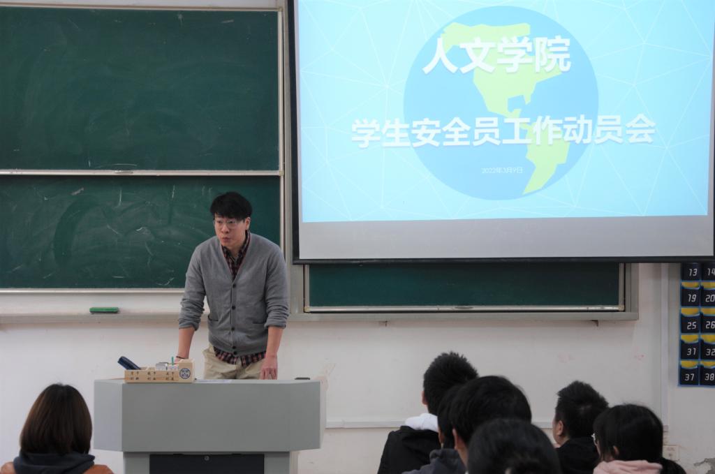为响应学校关于防范电信诈骗工作要求,积极落实人文学院学生安全工作, 3月9日12:30,在教学楼二阶教室人文学院召开了学生安全员工作动员大会。学院党委书记吴轶军、副书记韩铖、学工办主任童明明、辅导员马思齐出席了大会。全院各班级安全员参加了大会。会议由马思齐老师主持。