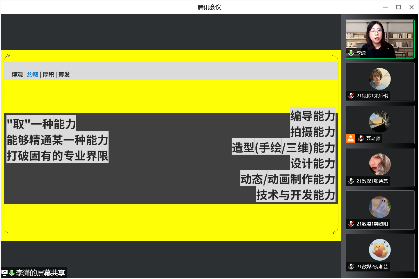 童艳副教授以“认识自我”为主题,和同学们一起讨论了大学生活、专业学习、职业规划等三方面内容。针对“大学生活”,童艳老师向大家介绍了为什么要认识自我、如何认识自我,她表示,同学们要将自身的兴趣点与能力优势相结合,这样能够更好地规划专业学习和职业生涯。在“专业学习”上,她表示软件学习并非最为重要的内容,相较而言,专业兴趣、美术技能和基础课程才是艺术类的同学们更需要去夯实的重要基础。在“职业规划”方面,童艳老师结合身边的实际例子,与大家分享了两个关键词,即“追求梦想”与“扬长避短”,她建议同学们要寻找梦想与现实的平衡点,结合实际条件去抉择,在追求梦想的同时更要抓紧当下的学习。