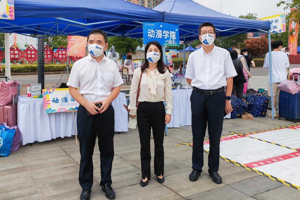 迎新现场活跃动漫元素。在2022级新同学入学报到当天,学院党总支部书记赵宁、院长王贤波、副书记副院长匡才远来到迎新现场,关心了解学院迎新工作开展情况,与新同学们、学院志愿者们亲切交谈。学院党政领导带头佩戴动漫学院口罩,学生志愿者身着特别设计的动漫学院志愿服,用温暖关怀和志愿服务,在新同学们心中留下动漫元素美好的第一印象。