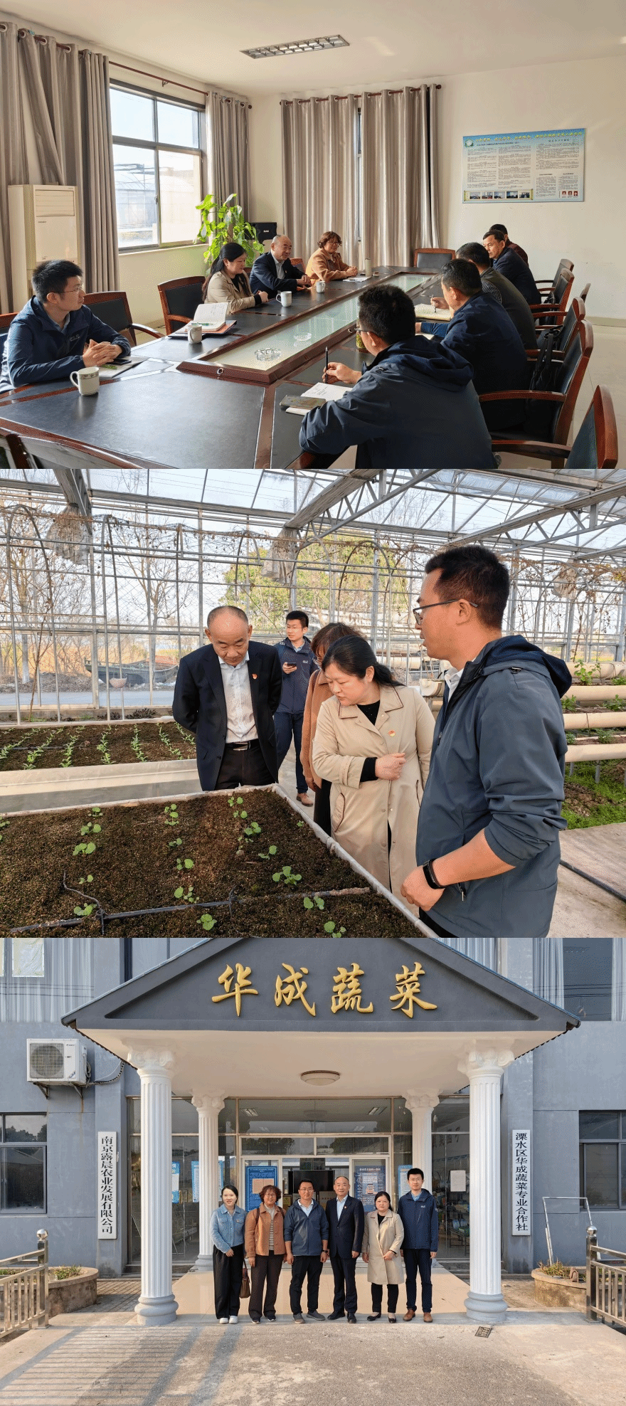 315日下午,园艺园林学院党委书记邢红飞、学院党委副书记甘黎明、园艺系主任崔群香、教师郭延乐、学工办副主任徐淑娟一行赴南京市溧水区华成蔬菜专业合作社开展访企拓岗工作。华成蔬菜专业合作社负责人路晓华,主任俞同军,贾斌,和凤镇镇长徐平,总经理冯顾城热情接待了邢红飞一行