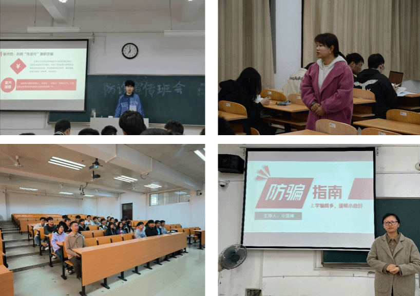 本次活动学院重点开展学生“反电诈”“一对一”谈话,在校学生当面沟通,因实习等未在校学生通过电话、QQ等方式沟通提醒,确保全院学生一个不落。针对大四学生校外活动多,环境变化大,危险系数高的客观情况,学院开展毕业季“反电诈”专题宣传教育讲座,围绕就业、培训、投资、交友等场景分类介绍最新电诈案件,增强学生安全意识。为进一步激发学生主动参与活动,组织开展“反电诈”主题班会并进行评比,鼓励学生以PPT、短视频、情景短剧、书法绘画等方式参与反诈宣传活动,引导学生在亲身参与中进一步增强安全保护意识,提高反诈防骗技能。同时,在学院教室走廊等公共场所树立多处反电诈标牌,努力让反诈防骗思想深植全院师生内心。