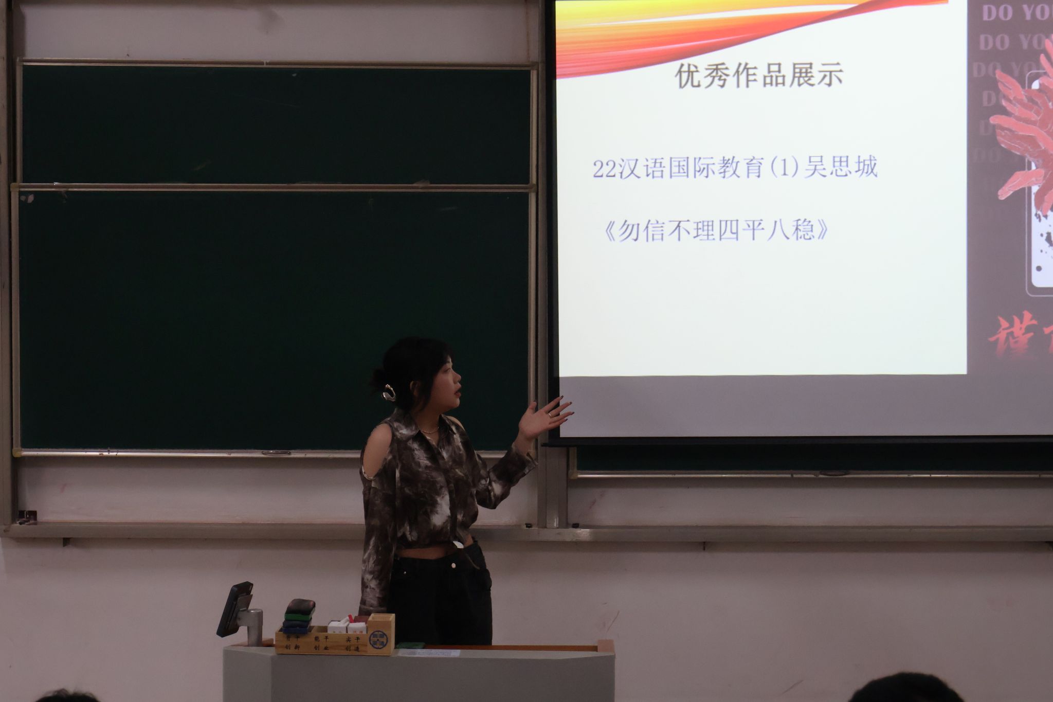 会议伊始,张老师首先为大家展示了优秀获奖作品,充分肯定了同学们原创作品,大家结合日常所见所闻,自编自导自演了“五花八门”电信网络诈骗案例,并通过创作提升自我反诈骗意识。随后,作品《疯传》作者之一,来自21级数字出版(2)唐洋洋同学从剧本的设计、视频画面与后期剪辑三个过程进行了分享,并警示同学们不可贪图便宜、误入骗局。海报设计一等奖作品《勿信不理四平八稳》作者来自22汉语国际教育(1)班吴思城同学,分享了她创作的思路,并介绍每一个精心设计的细节,所要传达出的反诈知识。最后,辅导员为获奖选手颁发了该活动获奖证书并合影留念。