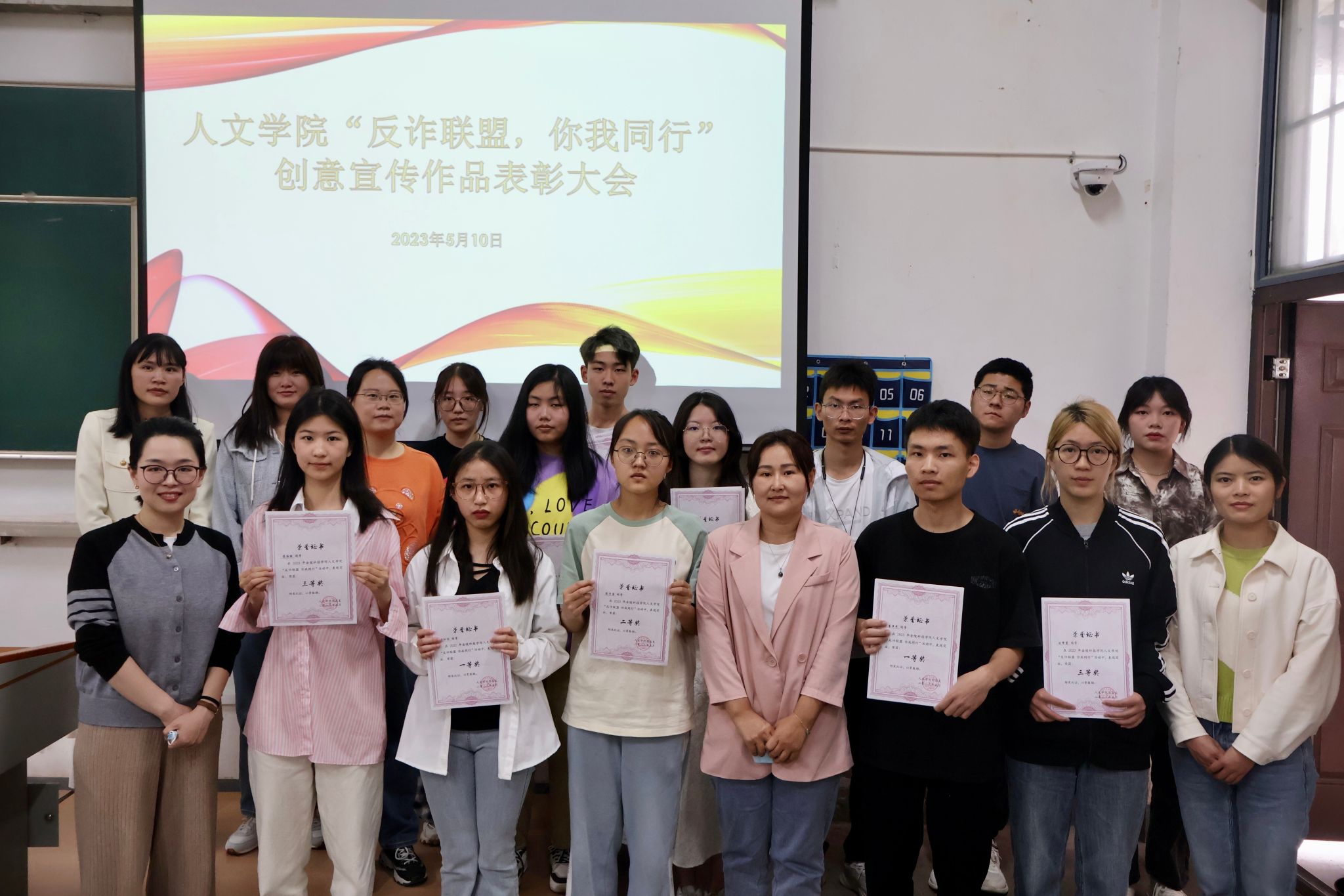 为切实增强校园反电信网络诈骗诈宣传力度,提高学生防骗意识。5月10日12:20在教二阶,人文学院举办了“反诈联盟,你我同行”创意宣传作品展播和评奖活动。我院全体辅导员、安全员和获奖学生代表参加了活动,辅导员张琳老师担任主持。