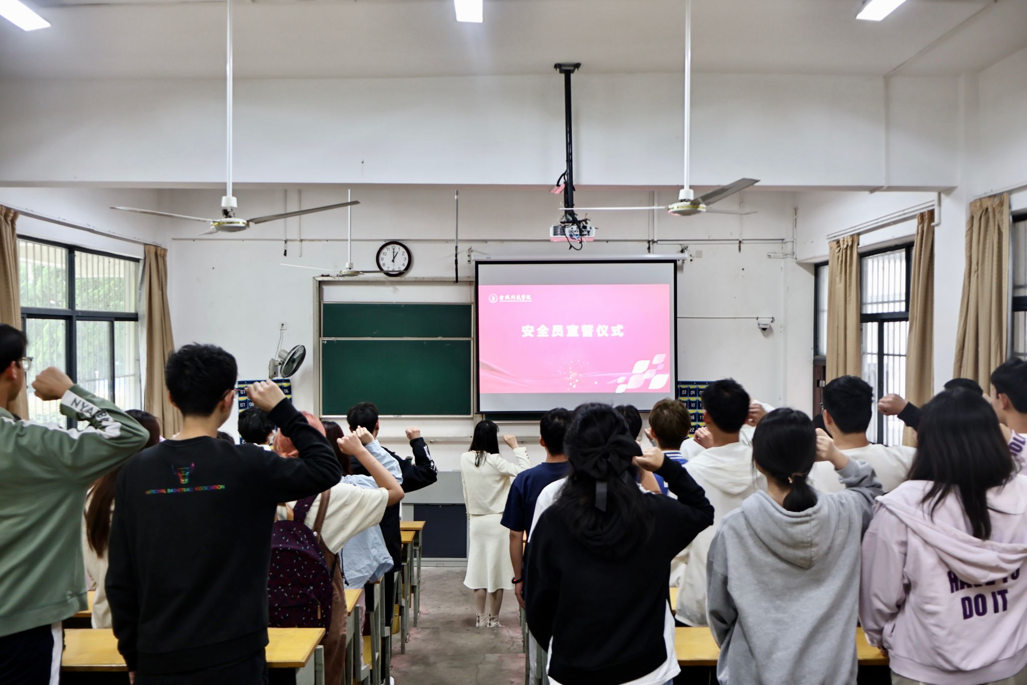安全员是“学校-学院-班级-宿舍”四级防护网中的重要一环。培训会上,张老师首先充分肯定了近期安全员的工作,并对防范电信网络诈骗向大家提出了的几点要求:强调要高度重视反电信网络诈骗工作,积极配合学校宣传和学习反电信网络诈骗知识,不断提高反诈意识。同时,带领大家认真学习了班级安全员工作职责,要及时转发学校的反诈信息至班级群,认真组织开展主题班会,宣传好“国家反诈中心”APP在预防网络诈骗方面的积极作用,充分利用线上、线下不同优势扩大宣传效果。生活中,必须要与宿舍安全员及时联系,充分发挥纽带作用,排查电信诈骗高危人群,把诈骗事件扼杀在摇篮里。有异常情况,要及时告知辅导员、班主任、保卫处,将损失降到最低。最后,为强化校园安全主人翁意识,张琳老师带领全体安全员进行了宣誓,每位安全员都郑重承诺履行好安全员职责。