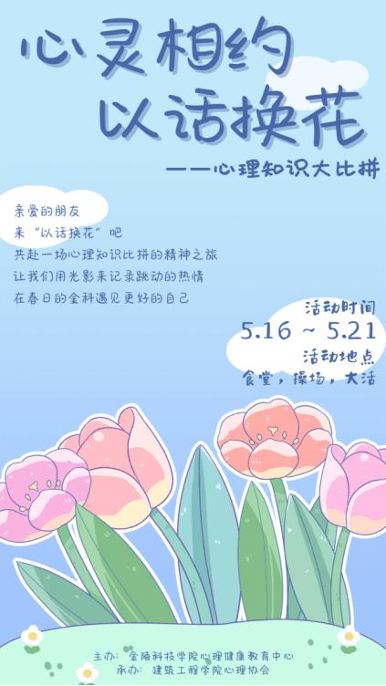 525“我爱我”心理健康日到来之际,为引导同学们关爱自我、珍惜生命,重视自身的身心健康,建筑工程学院于5月16日至5月21日举办了“重塑新秩序,青春再启航”心理健康教育金科行之“心灵相约•以话换花”活动。本次活动由大学生心理健康教育中心主办,建筑工程学院心理协会承办。