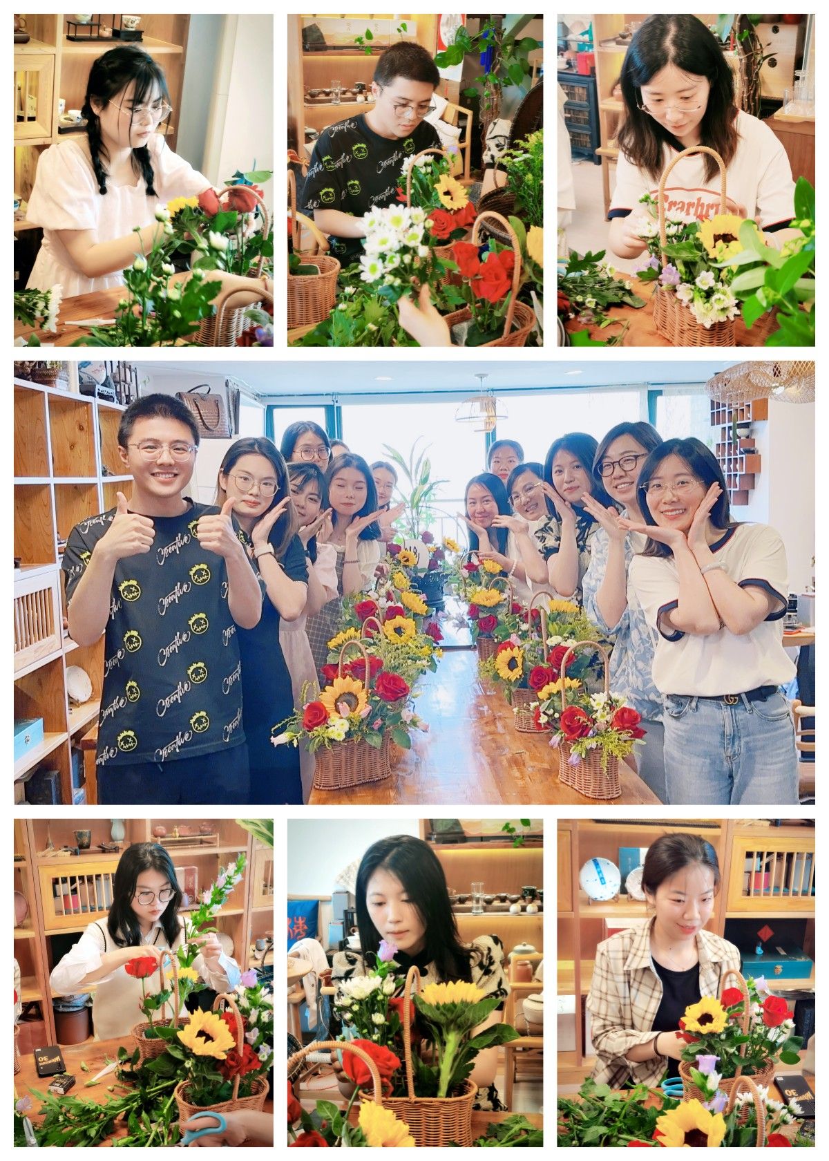 在沙老师的示范和指导下,师生们纷纷化身花艺师,灵活运用所学到的理论知识,凭借个人对“美”的不同理解,一边交流探讨,一边修枝剪叶、搭配色彩、设计造型,享受着亲手创作的乐趣。一盆盆错落有致、创意十足的插花作品随即展现在大家眼前,令人赏心悦目。