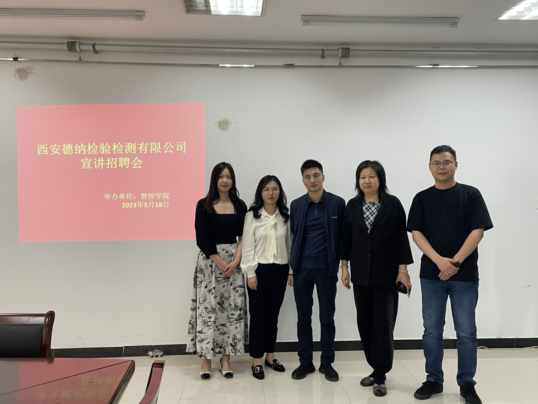 5月18日下午1:30,智控学院在科技楼4号楼710会议室举办了一场小型招聘会,邀请的企业是西安德纳检验检测有限公司。智控学院党总支部书记戴典芬,西安德纳检验检测有限公司技术总监王经理、人事总监王经理,毕业班辅导员黄伟,毕业班班主任张玲出席了此次招聘会,我院三十余名毕业生参加了此次招聘会。