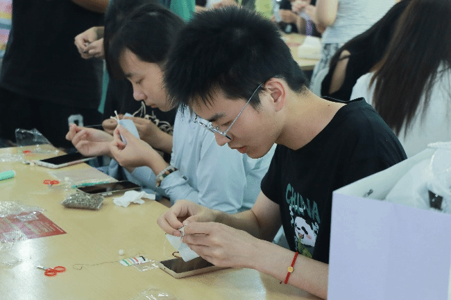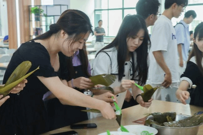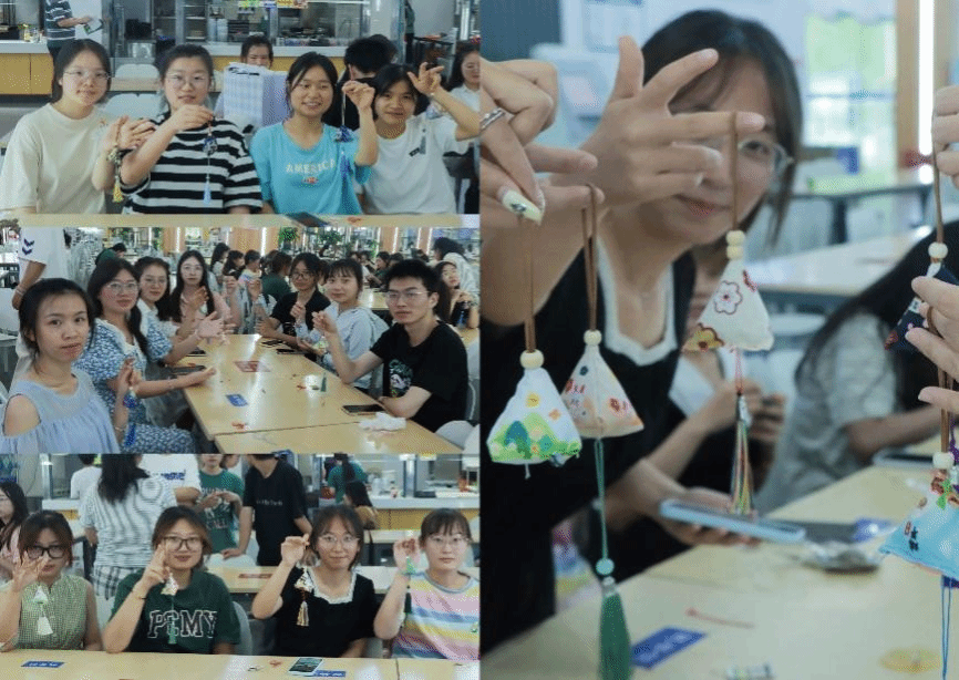 在活动现场,同学们围成一圈,互相交流,互相学习。“先拿一片粽叶把它卷起来,窝一个角,这样米就不会漏出来……”在食堂阿姨的悉心指导下,学生们配合默契,渐渐摸索出门道,一张张翠绿的粽叶在同学们手中翩翩起舞,忽而四四方方、有棱有角,忽而又一头尖尖、好似龙角。不多会,三角形、长条形等各式各样的漂亮粽子逐个在同学们手中诞生了。此外,活动中大家还制作了香囊,同学们按照香囊制作步骤方法,忙活开了,穿针引线,一个个美丽精致的香囊不一会就完成了。同学们用手中的针线表达对家人的深厚感情、对朋友的纯洁友谊,更让大家感受到了传统文化的独特魅力。活动现场气氛热烈,同学们在包粽子和香囊的制作过程中感受着浓浓的节日气氛。