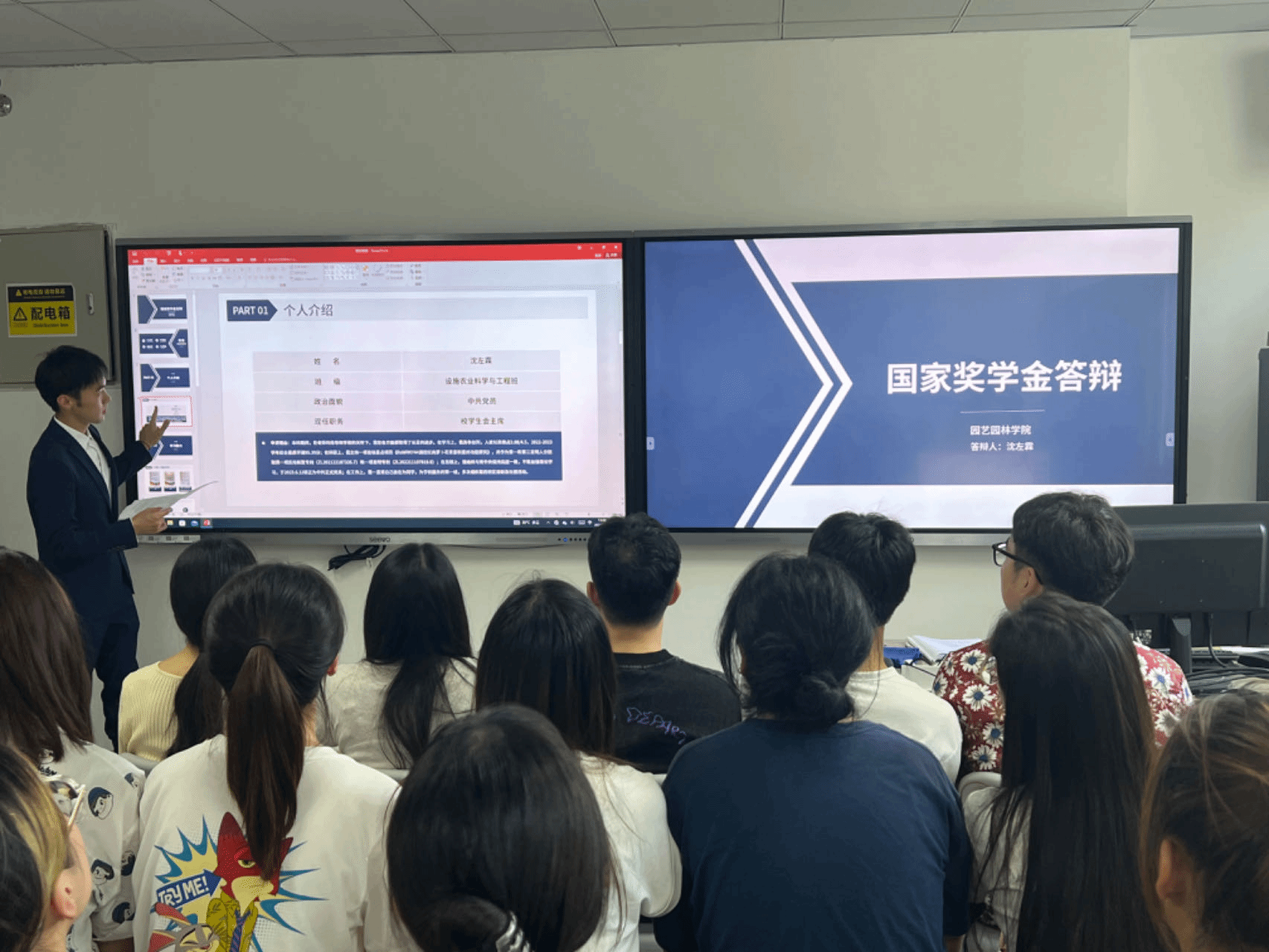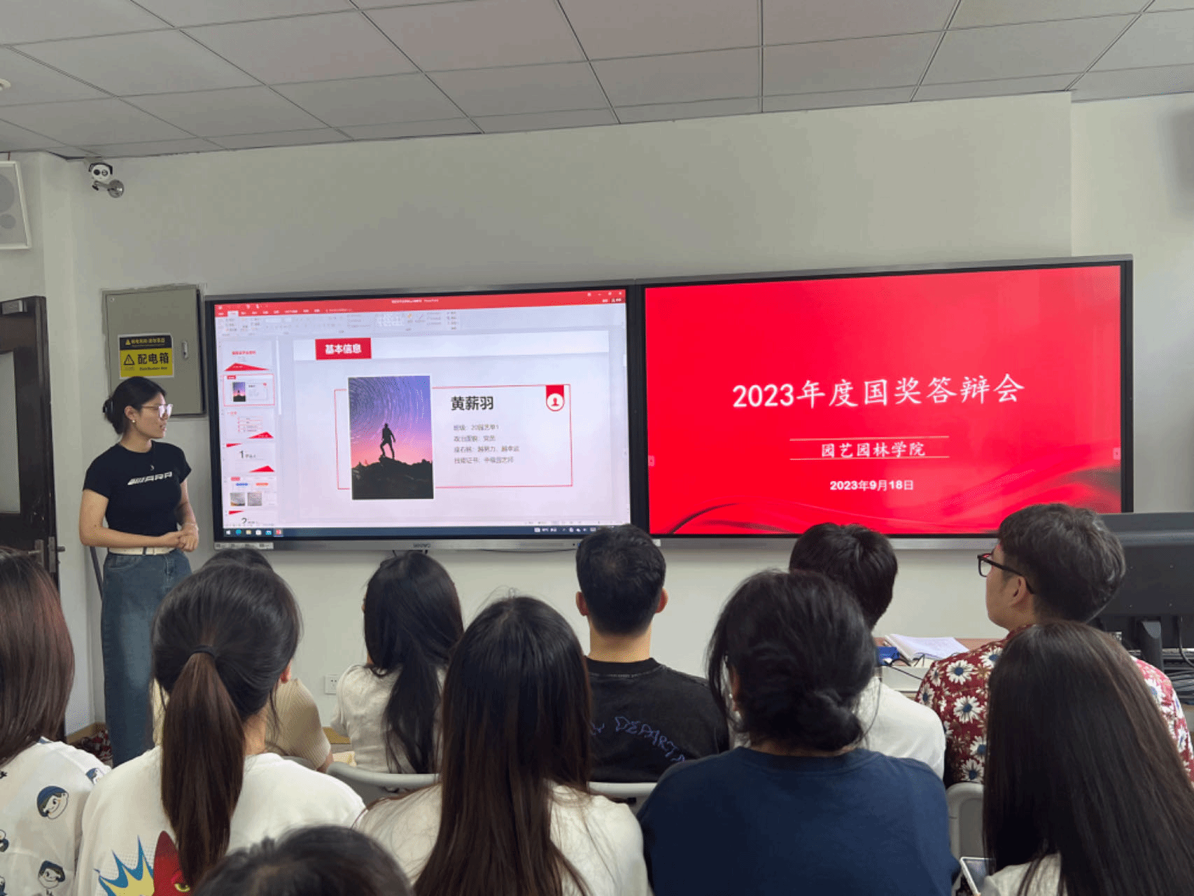 为更好地激励广大学生积极进取,奖励优秀学子,园艺园林学院于2023年9月18日下午在实验楼B303举行2023年度国奖答辩会。参加本次答辩的有学院党委副书记甘黎明、全体辅导员、三名竞选人以及学生观众。