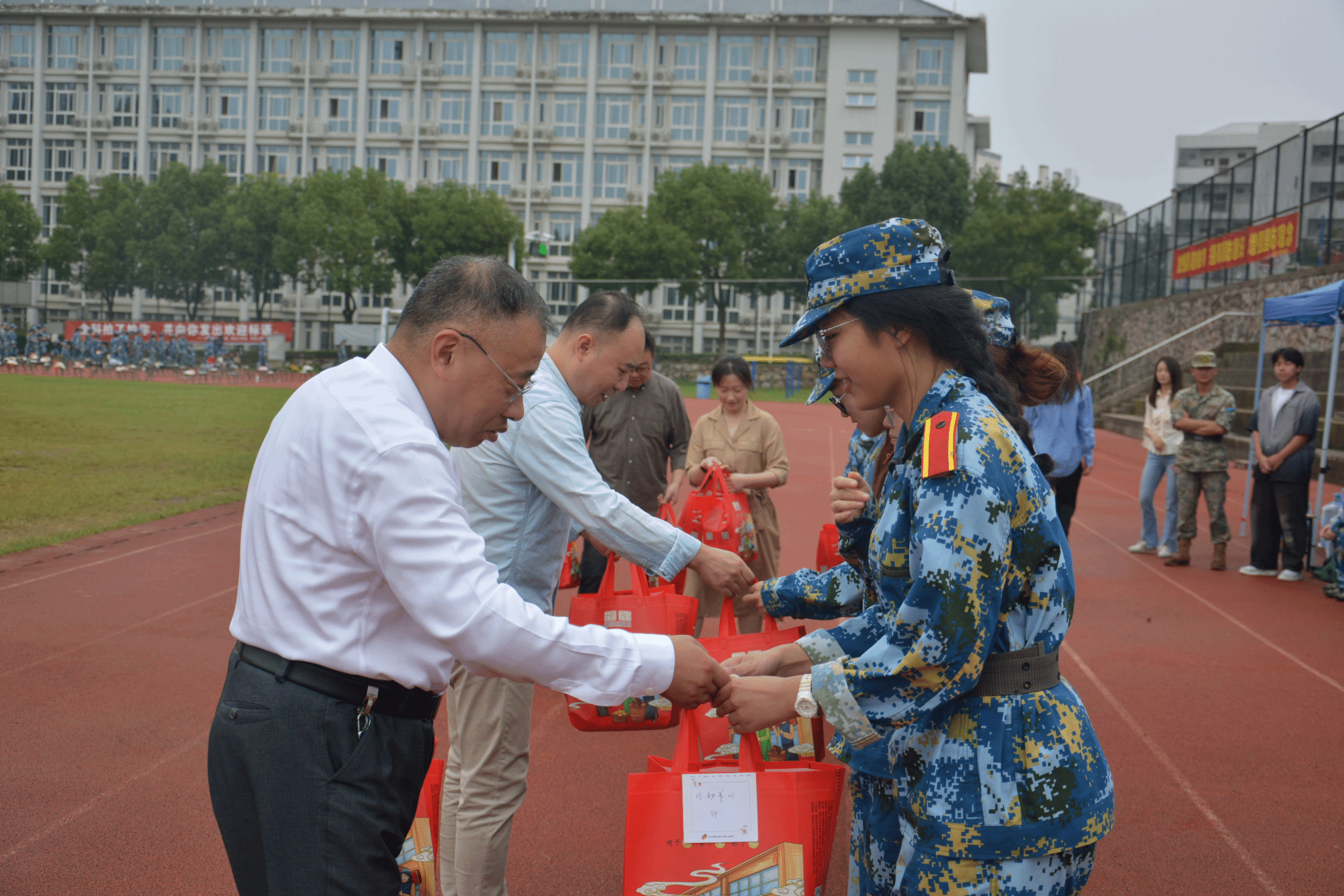 慰问伊始,领导们为学生代表发放装有月饼的中秋礼包,每一份月饼都印有专属于人文学子的祝福“秋月明亮照心房,金科人文祝成长”,同学们洋溢着幸福的笑容,感受到了学院的温暖关怀。吴书记代表学院向军训教官表示诚挚的感谢,并对同学们在训练中表现出的昂扬斗志以及饱满的精神面貌表示高度称赞,同时叮嘱同学们保重身体,做好身体防护。希望同学们能够通过军训锻炼吃苦耐劳的意志品质,增强集体观念和纪律意识,将军训精神贯彻到日后的学习生活中。