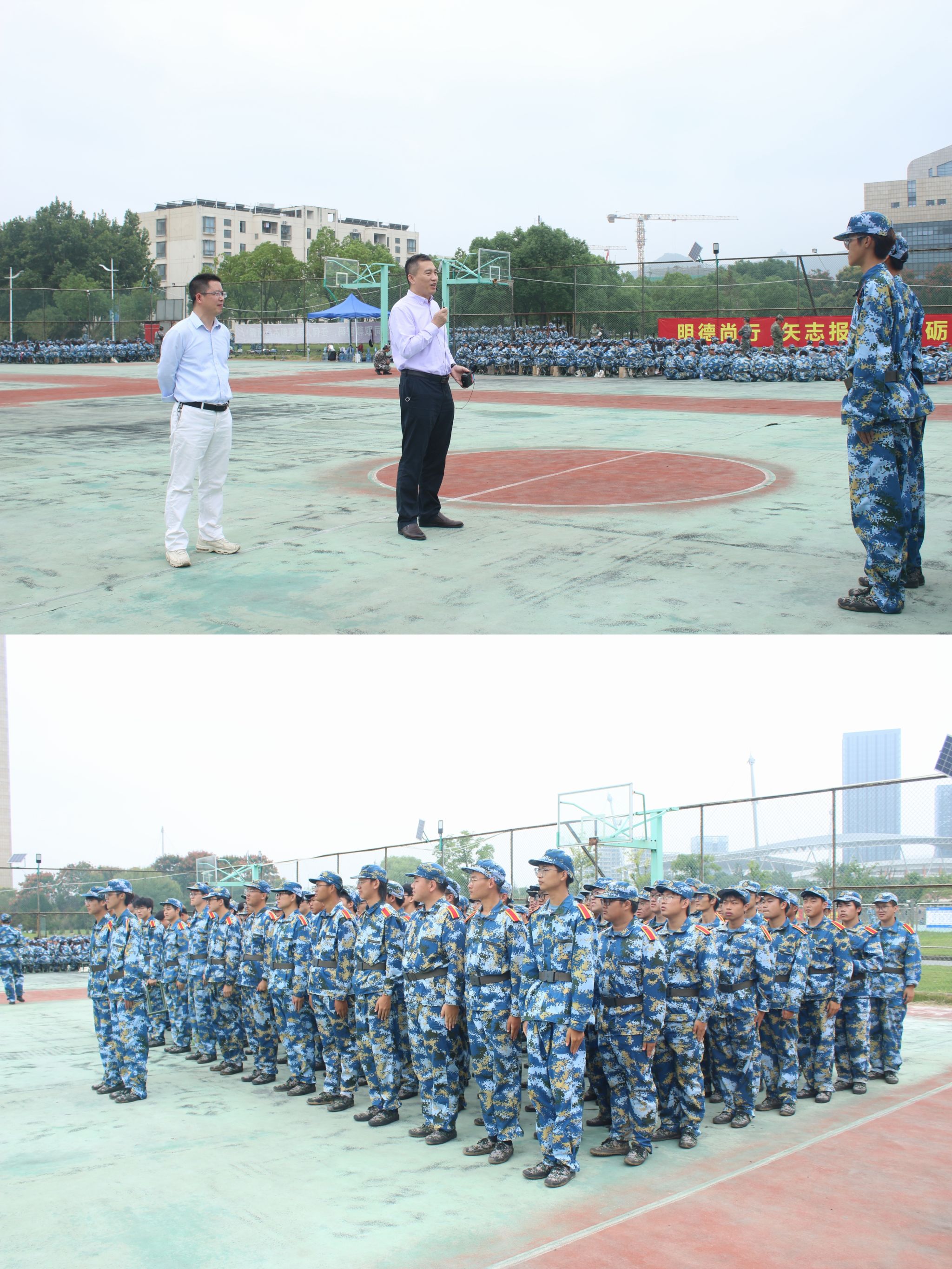 随后学院领导及老师来到操场的军训方阵慰问参训的本科新生,面对朝气蓬勃的的学子,徐志国书记嘱咐新生,作为软件学院学子要刻苦学习、锐意创新,要以听党指挥,能打胜仗,作风优良,绝对忠诚的标准要求自己,迎接军训、迎接挑战,在军训汇报中展现出软件学子精气神。