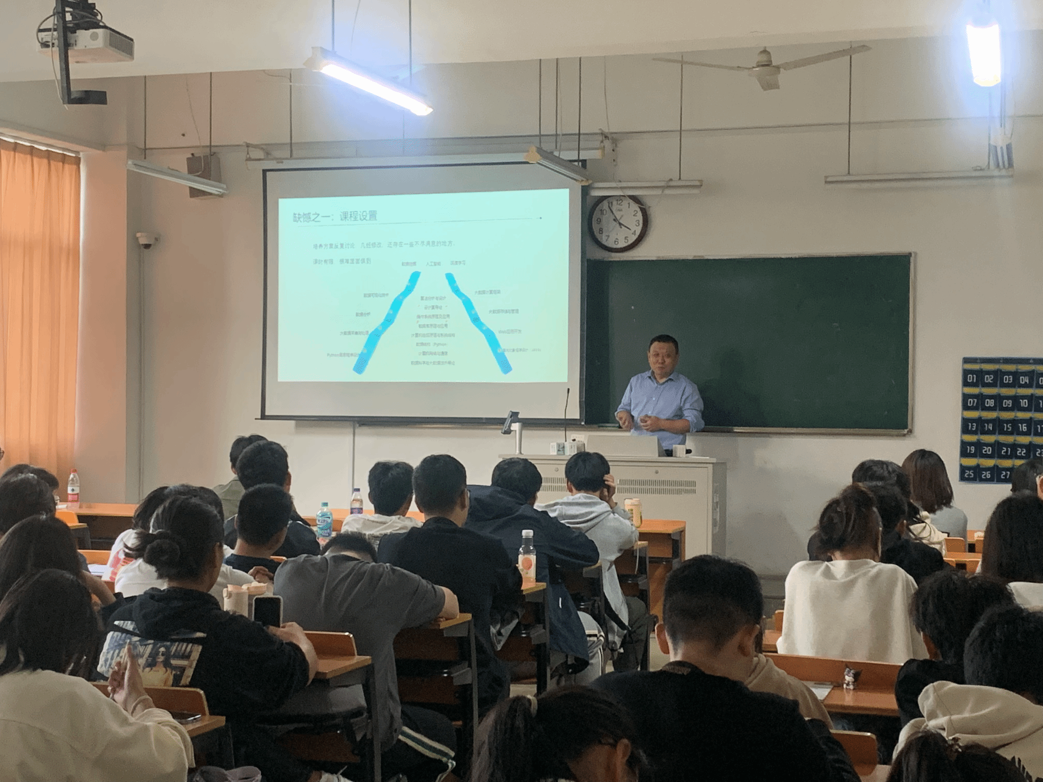 首先,谢教授详细介绍了大数据专业的学科发展、专业背景以及人才培养方案。接着,谢教授介绍大数据专业招生和就业情况,用详实的数据介绍专业领域优势、就业现状和趋势。使新生进一步认识大数据专业的就业与发展前景。最后,谢教授针对学生提出的有关选课及考研等相关问题一一做了详细解答。