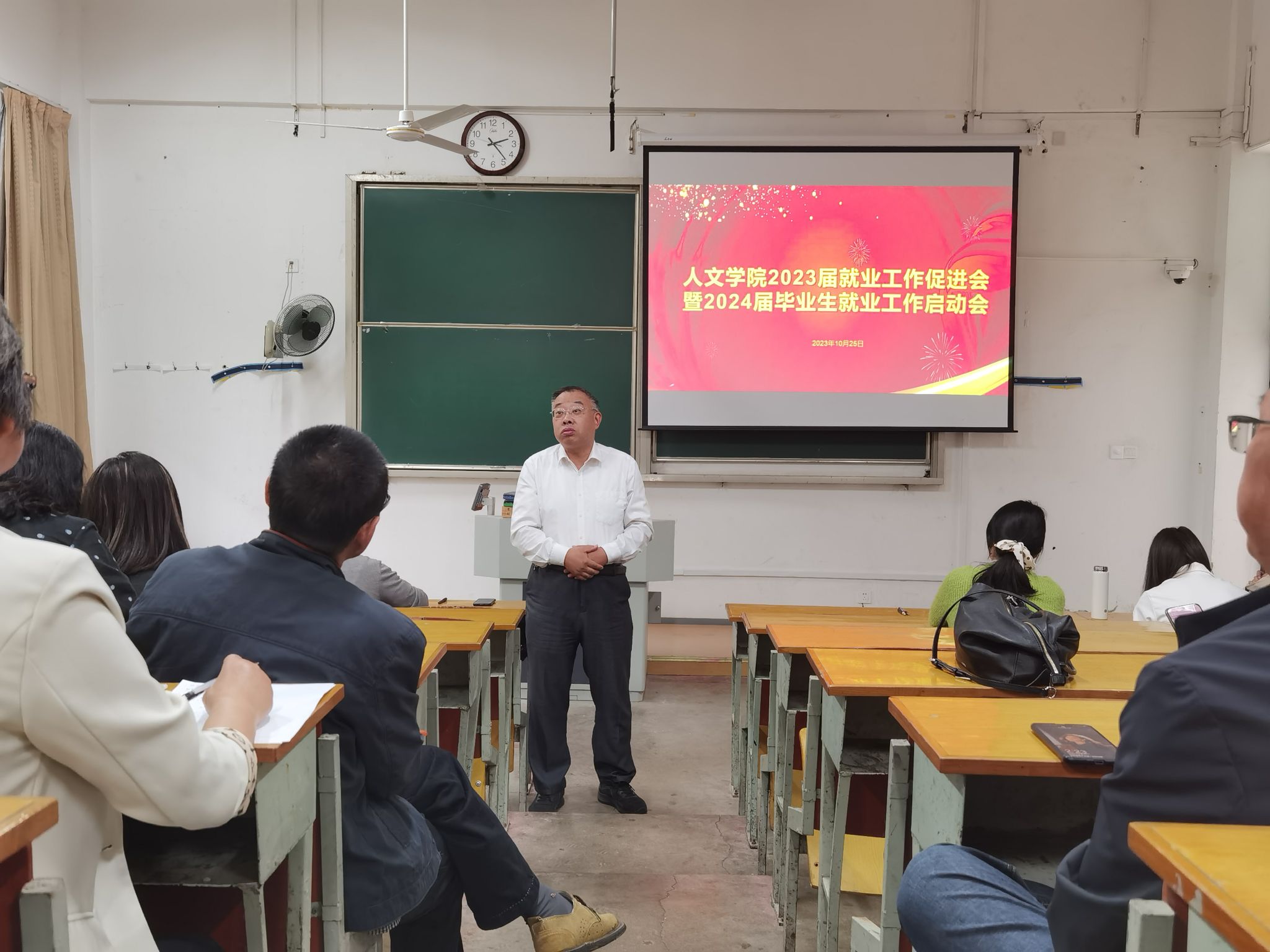 10月25日下午,人文学院在教学楼二阶召开了2023届就业工作促进会暨2024届毕业生就业工作启动会。人文学院党委书记吴轶军、院长张维亚、党委副书记韩城、副院长赵步阳,与各系正副主任、毕业班班主任及辅导员参加了会议。