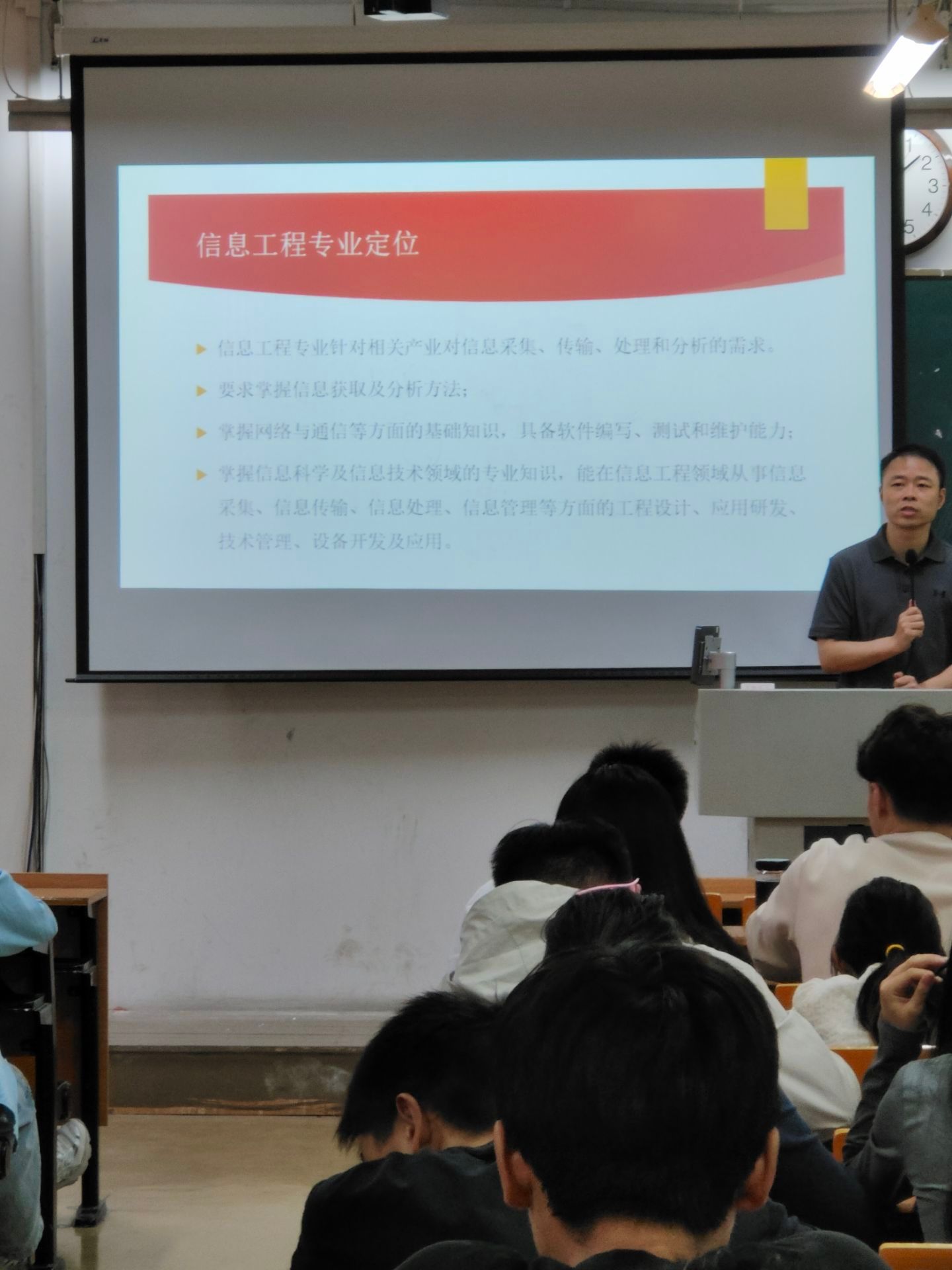 讲座的第一部分,孙健副教授讲解了信息工程专业的内涵、定位,让学生透彻了解了专业的发展前景和就业方向。讲座的第二部分,孙健老师对信息工程专业学生职业发展规划提出了相关建议,建议学生们要明确职业发展的相关要求,提前做好职业规划。