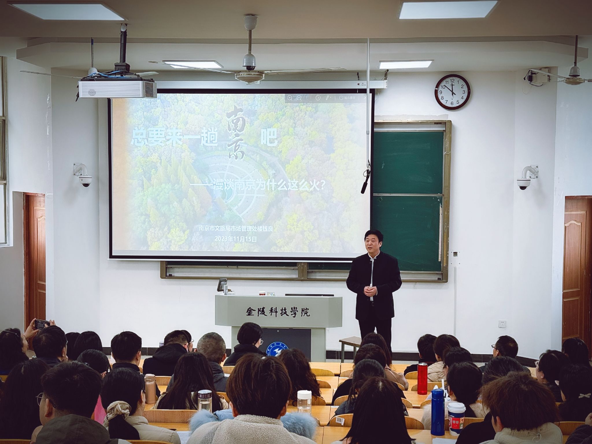 11月15日,由科技处、教师发展中心主办,外国语学院承办的第二十四期“金科学术讲堂”在江宁校区8300教室顺利开讲。本次学术课堂特邀南京市文化和旅游局市场管理处处长楼钱良以《总要来一趟南京吧——漫谈南京文旅市场为什么这么火》为题,举办专题讲座,约200名师生参加。我校外国语学院党总支部书记李星主持讲座。