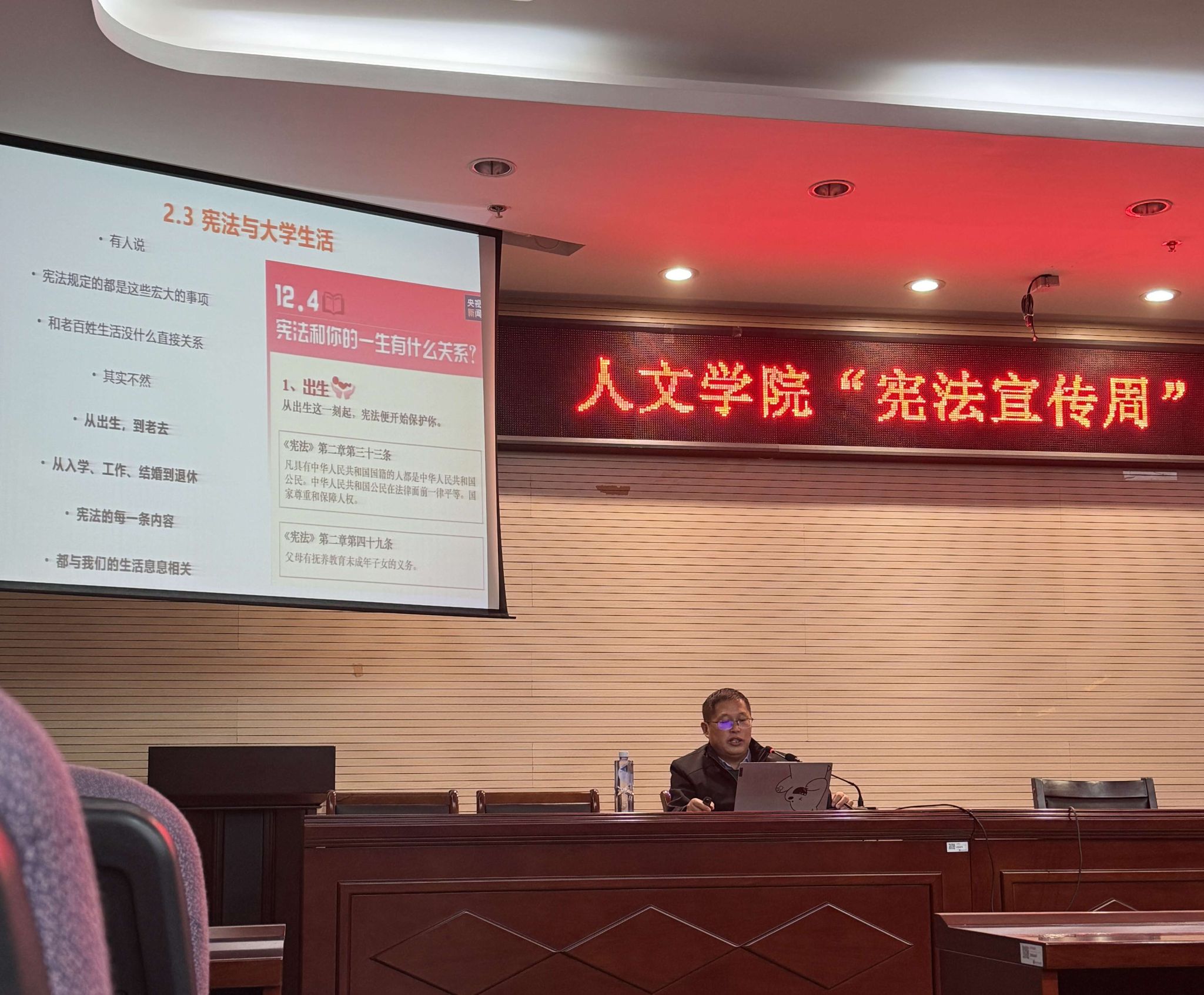 为大力弘扬宪法精神,建设社会主义法治文化,增强大学生的法治意识,争做知法守法用法的好青年,值第十个国家宪法日来临之际,开云在线人文学院青年法学会、普法志愿者大队及金科法律服务工作室于11月29日下午3:00,在图教楼报告厅开展以“大学生活与法律智慧”为主题的宪法与法律知识讲座。此次讲座由开云在线人文学院行政管理系系主任、南京市农科教讲师团教师、南京市司法局行政执法社会监督员戴仁荣副教授主讲,本次讲座共有100多名同学慕名参加。