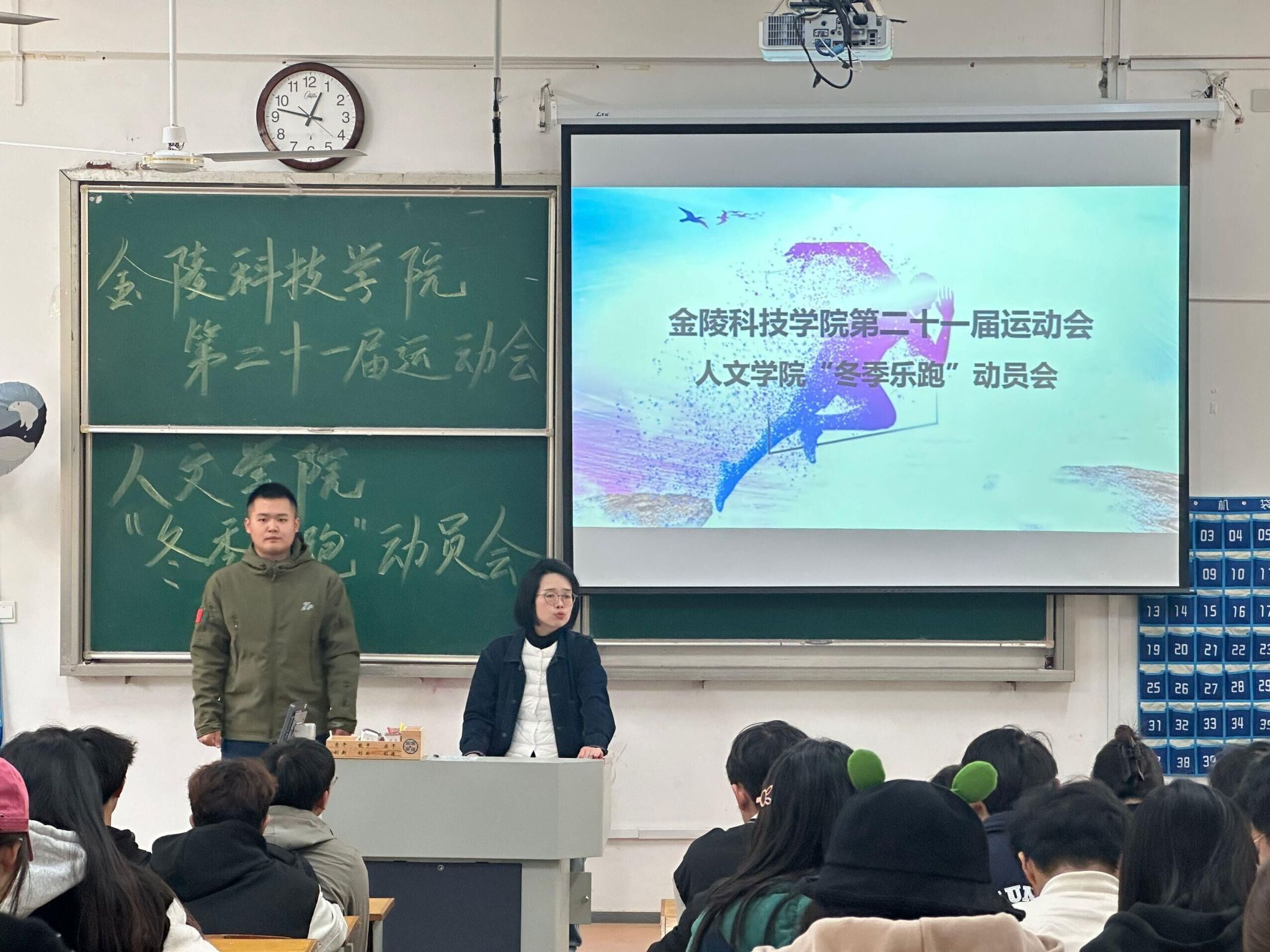 为增强学生身体素质,积极开展体育锻炼,人文学院积极响应校第二十一届运动“冬季乐跑”活动号召,1129日中午1230,学院在幕府校区教二阶召开了本次“冬季乐跑”动员会。大会由靖晶老师主持。