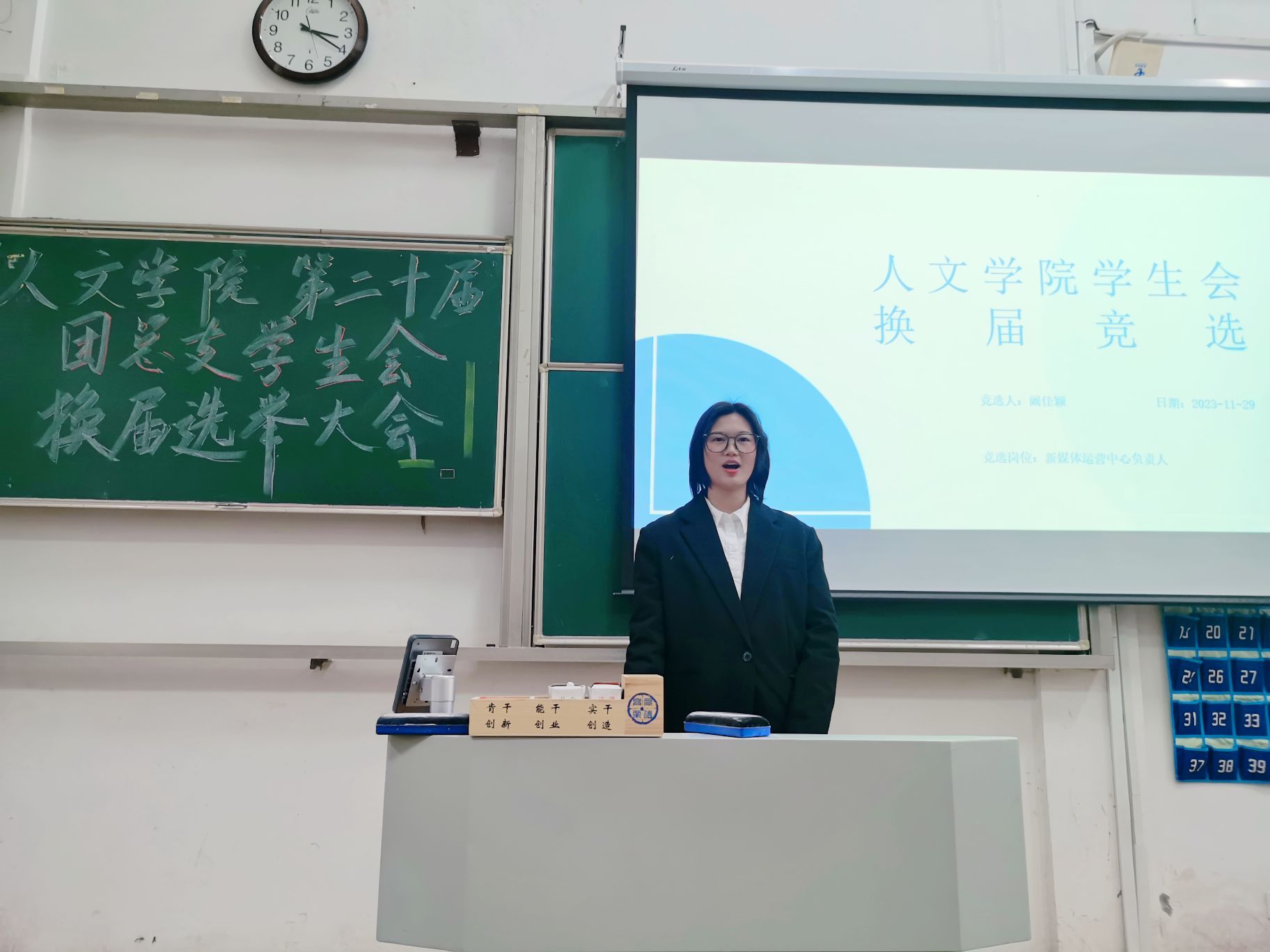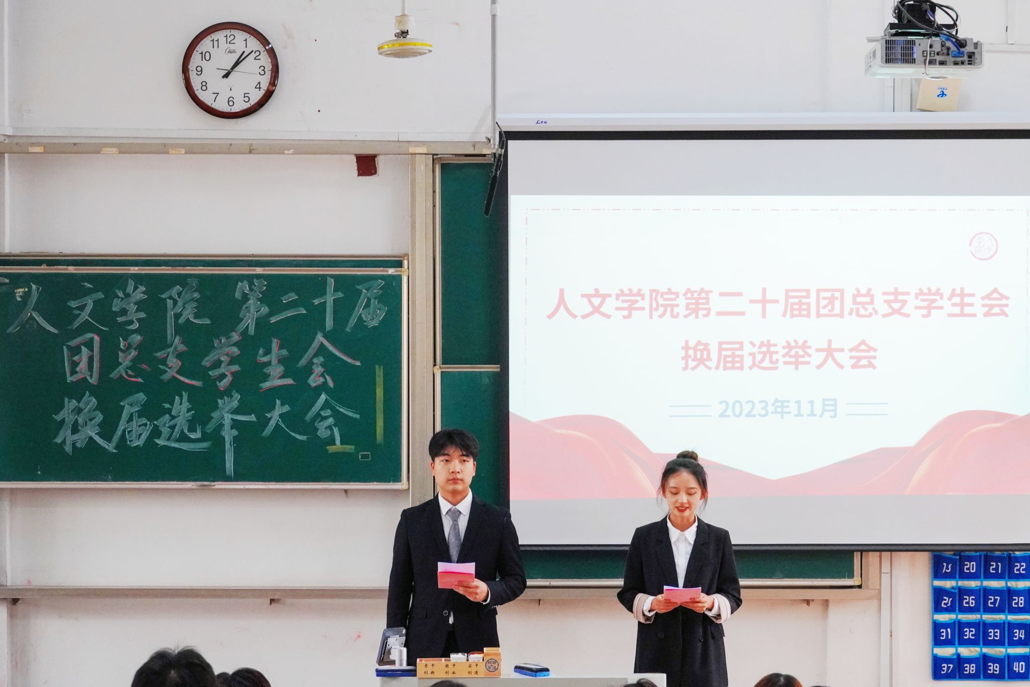 为保障我院学生会工作的连续性,充分发挥学生会的服务职能,弘扬 “严谨、勤勉、求实、创新”的作风,1129日下午13:00,人文学院在幕府校区教三阶举行了第二十届团总支学生会换届选举大会。人文学院党委副书记韩铖、学工办主任童明明、团总支书记高欢欢参加了本次选举大会。