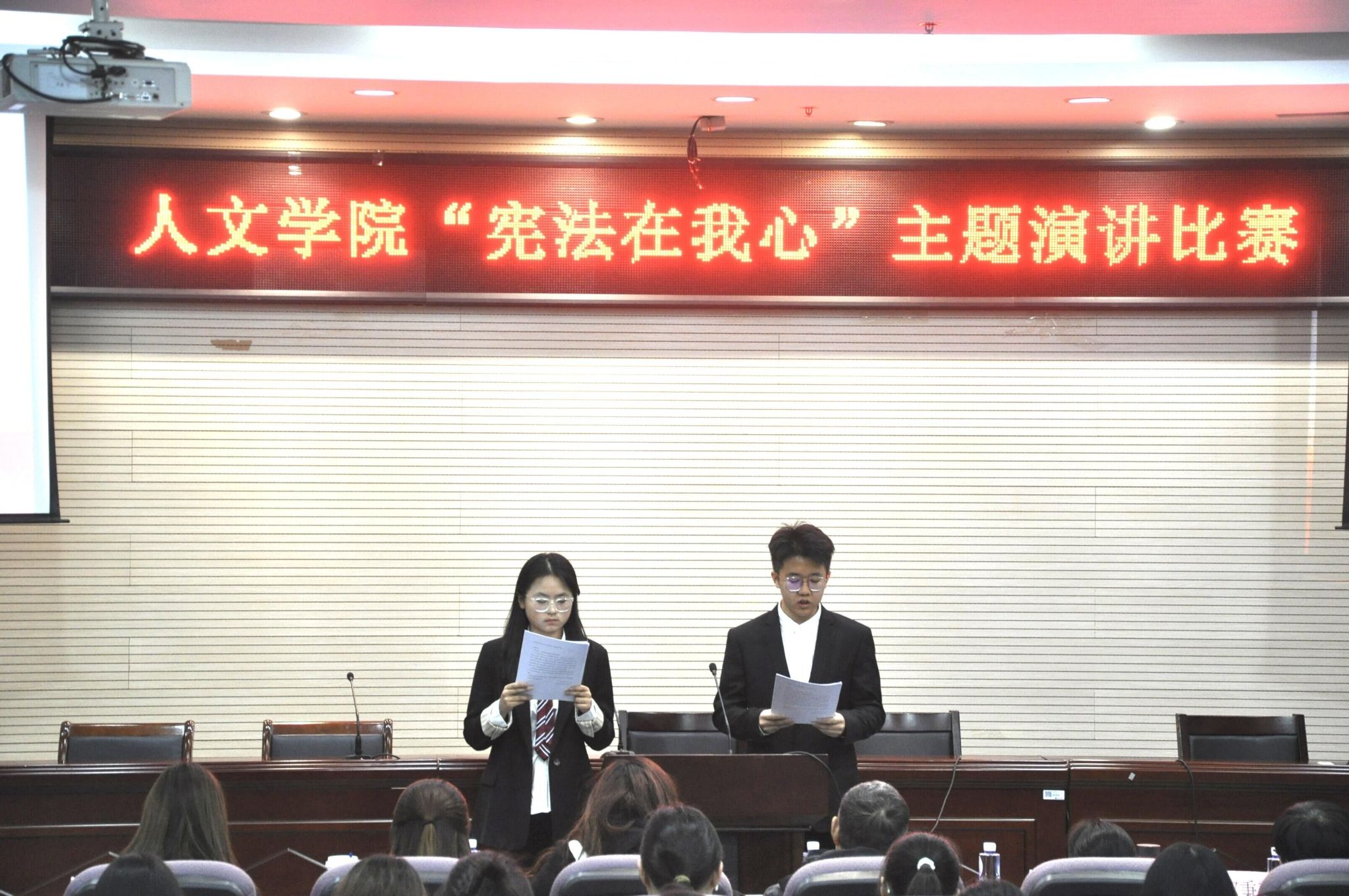 2023年12月4日是第十个“国家宪法日”。为弘扬宪法精神,深入宣传贯彻习近平法治思想,培养大学生的宪法和法治意识,建设社会主义法治文化。12月6日下午2:00,在图书馆报告厅,人文学院青年法学会、金科法律工作室以及金科普法志愿者大队联合主办的第五届“宪法在我心”宪法主题演讲比赛正式举行。本次活动邀请了人文学院行政管理系主任、党支部书记戴仁荣,以及行政管理系专业教师陈协平、郭秉菊、陈丽4名教师担任评委,同时第四届宪法主题演讲比赛一等奖获得者华钰洁同学,五四青年节演讲朗诵比赛演讲组一等奖获得者耿紫嫣同学,青年法学会负责人但文清同学,担任学生评委。