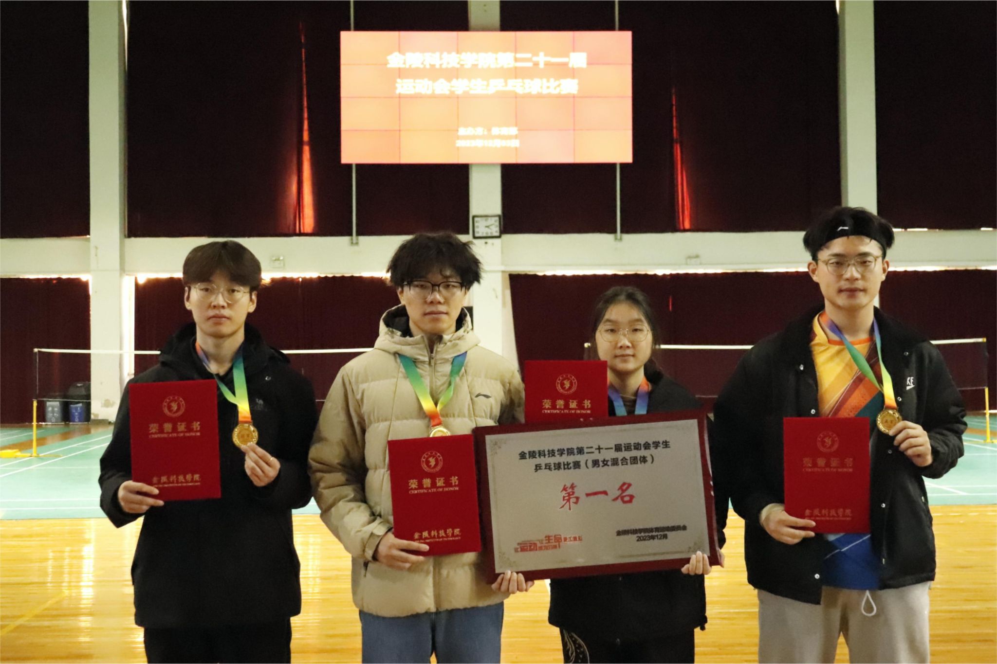 在充满活力与激情的竞技场上,我院参赛选手们用精湛的技艺和顽强的拼搏精神,一路过关斩将,攻防有序,为观众呈现了一场精彩的乒乓球盛宴。我院李华杰在比赛中的表现尤为出色,他在单打小组赛、八强赛和半决赛中,均表现出良好的心理素质,发挥稳定。在团体小组赛半决赛中,我院田忠仁2:0拿下第一分,沙敏以2:0梅开二度拿下了第二分,顺利进入决赛;在决赛对阵强敌中,我院卞显好和计算机学院同学不相上下,比分来到2:2紧张时刻,卞显好最终为团体拿下了激动人心的一分。一道道精美的弧线,一个个刁钻的角度,一次次凶狠的扣杀,本次乒乓球比赛在激情与智慧的碰撞中圆满落幕。选手们发挥特长、密切配合,相互支持,最终我院取得了男子单打亚军、 男女混合团体冠军的好成绩。