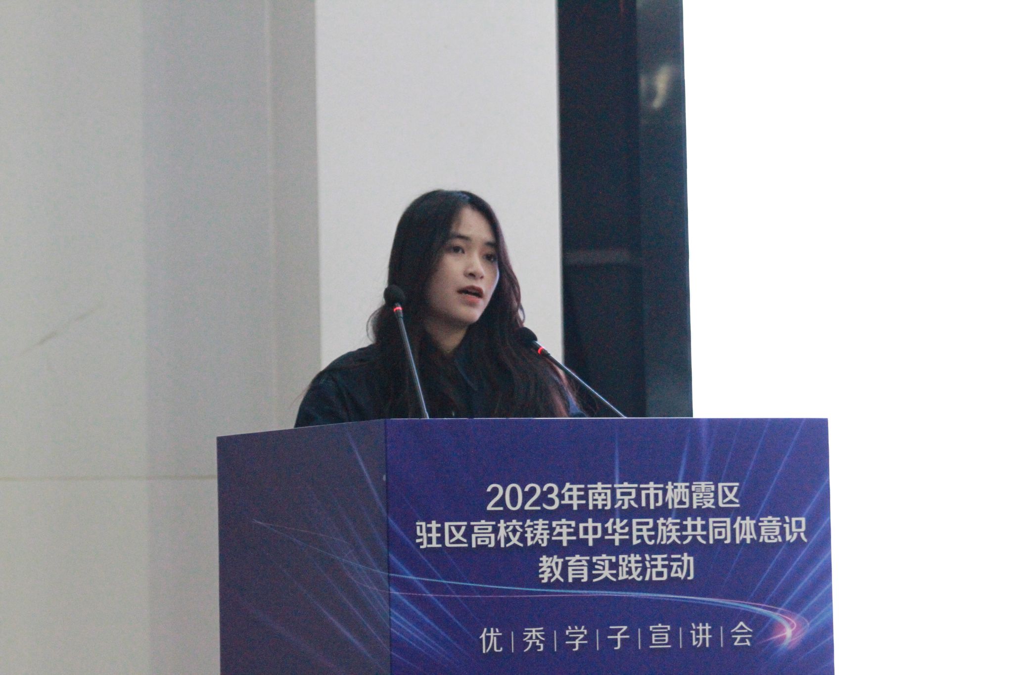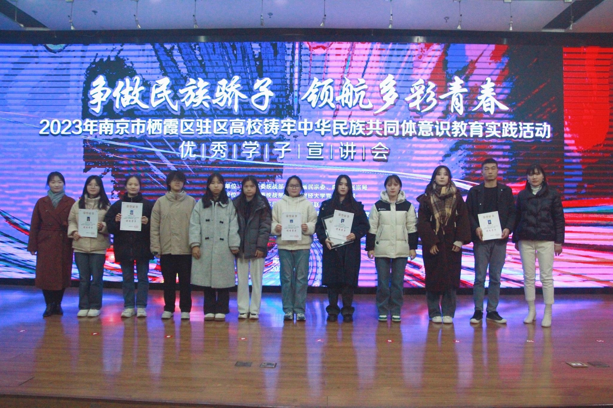 12月26日下午,由栖霞区委统战部和南京财经大学联合主办,栖霞区民宗局、栖霞区工商联、栖霞区民促会承办的“争做民族骄子,领航多彩青春”2023年南京市栖霞区驻区高校铸牢中华民族共同体意识教育实践活动——优秀学子宣讲会在南京财经大学图书馆报告厅举办。我院21汉语国际教育(2)班陈诗琪同学作为我校代表参加了现场展示。