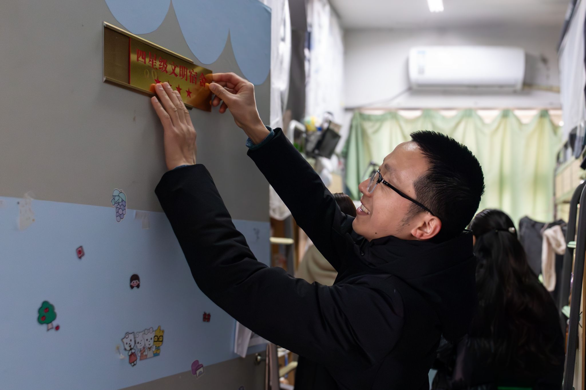 走进宿舍里,陈智慧副书记亲自为获得荣誉的宿舍进行颁牌,她表示星级宿舍是对同学们的肯定和褒奖,是大家的学习榜样。陈智慧副书记还与同学们进行了亲切地交流,鼓励同学们要继续保持良好的生活习惯和卫生习惯,注重心理健康,学会在期末备考时劳逸结合,寻找学习和休息的平衡点。辅导员赵志伟为四星级宿舍挂牌,对同学们在宿舍卫生安全、宿舍文化建设方面取得的成果表示了充分的肯定。获奖宿舍同学纷纷表示会倍加珍惜这份荣誉,为营造良好的宿舍环境做出更多的努力。