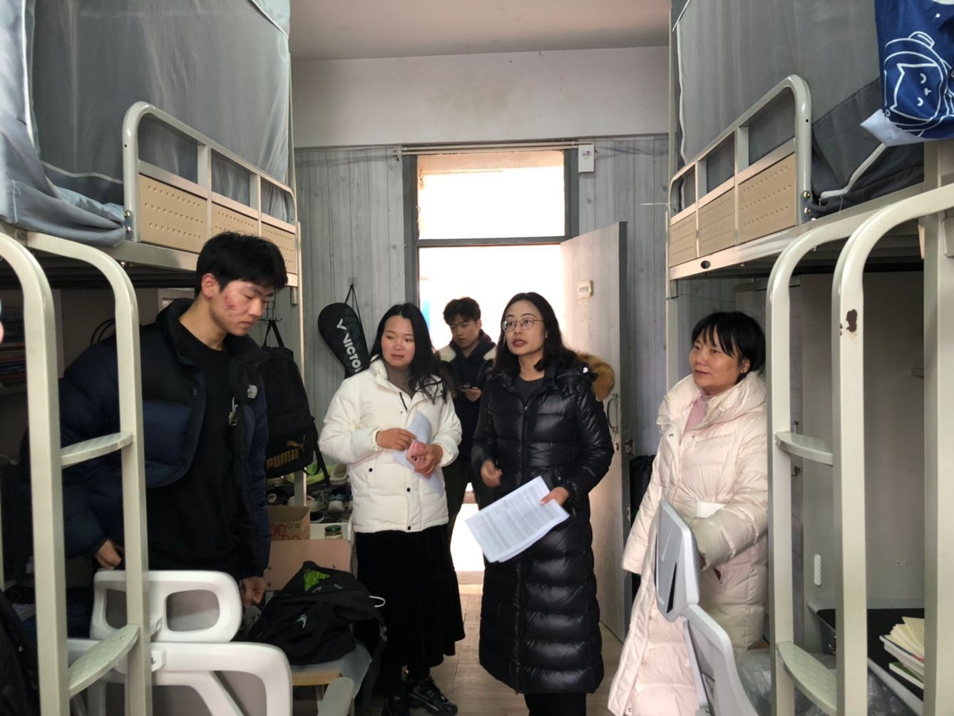 2月25日下午,网通学院党委书记沐阳带领全体辅导员深入学生宿舍,对北区02栋、北区05栋、南区08栋学生宿舍用电安全及宿舍卫生情况进行了检查,尤其对可能使用的大功率违规电器进行了排查,督促学生不要私拉乱接,注意自身用电安全。