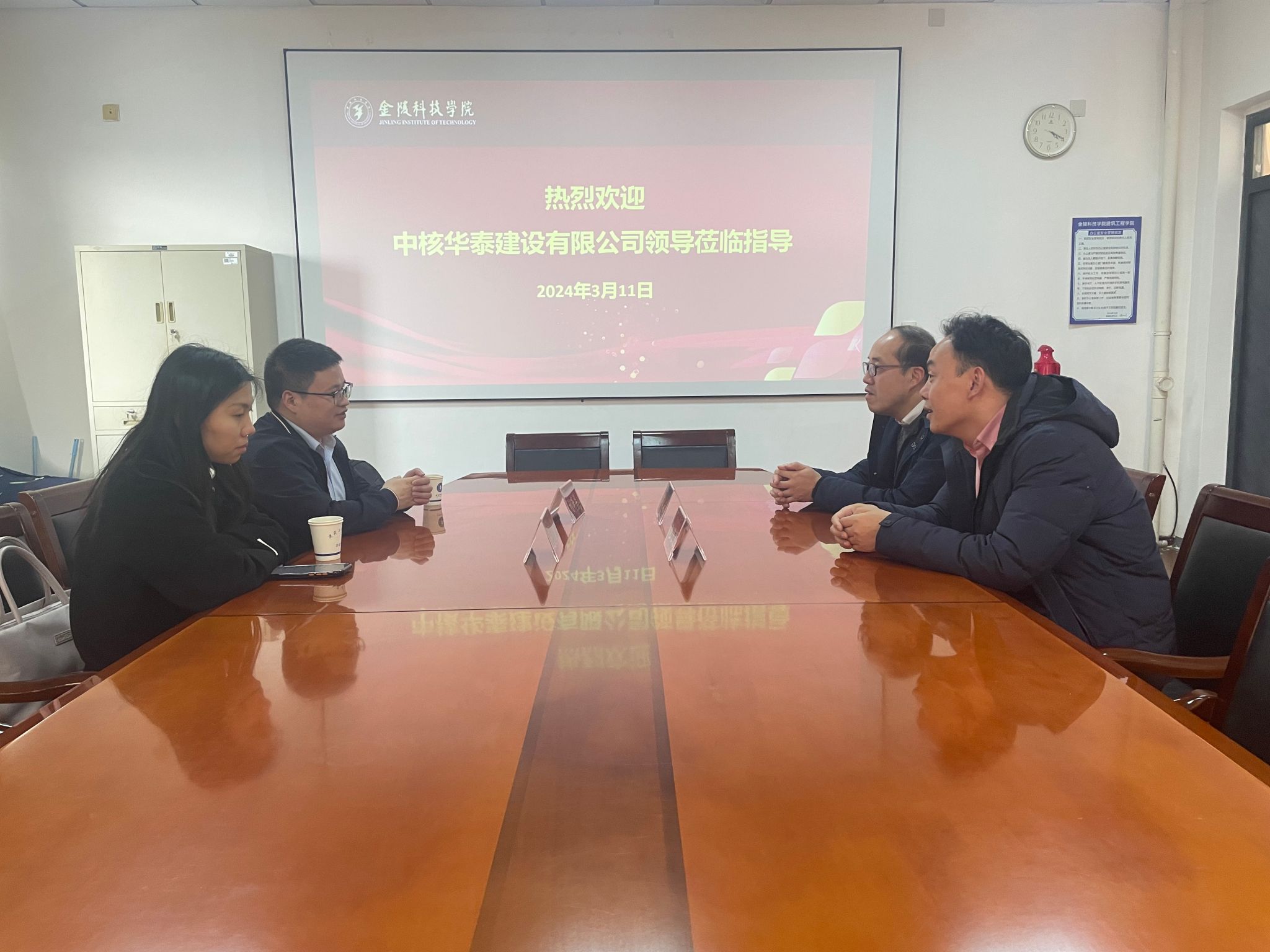 为了进一步推动学院2024届毕业生就业,加强学院与优质企业的联系,建筑工程学院特邀中核华泰建设有限公司人力资源部部门助理刘泽华、招聘专员沈小萌到院洽谈合作。学院党委副书记郑庆秋、学工办副主任鲍飞豹参加。会议由鲍飞豹主持。