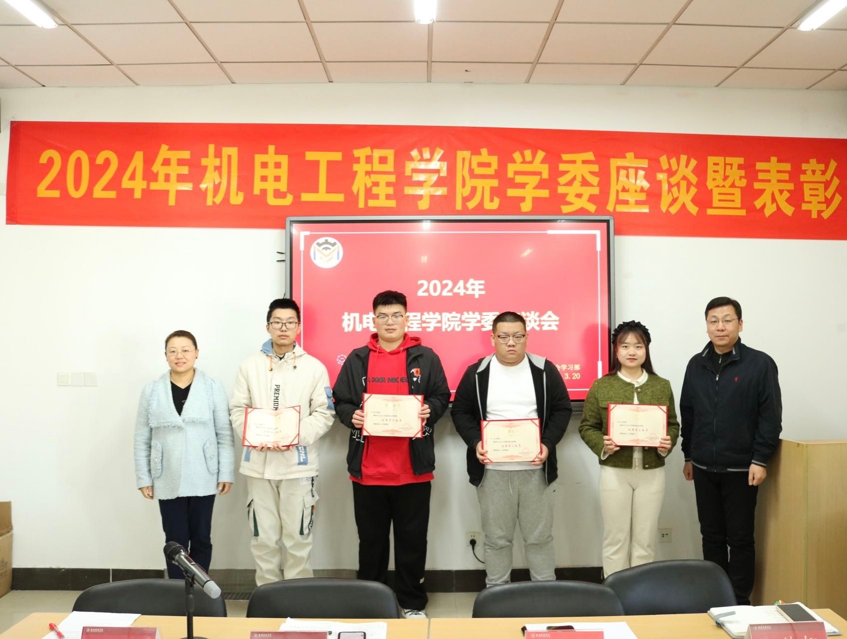 最后,王佳宣读了2023年度机电工程学院优秀学委获奖名单,张蓉副书记和刘祥建副院长共同为优秀学委颁发奖状。优秀学委代表就如何做好学委工作、打造优良学风分享了经验和方法。