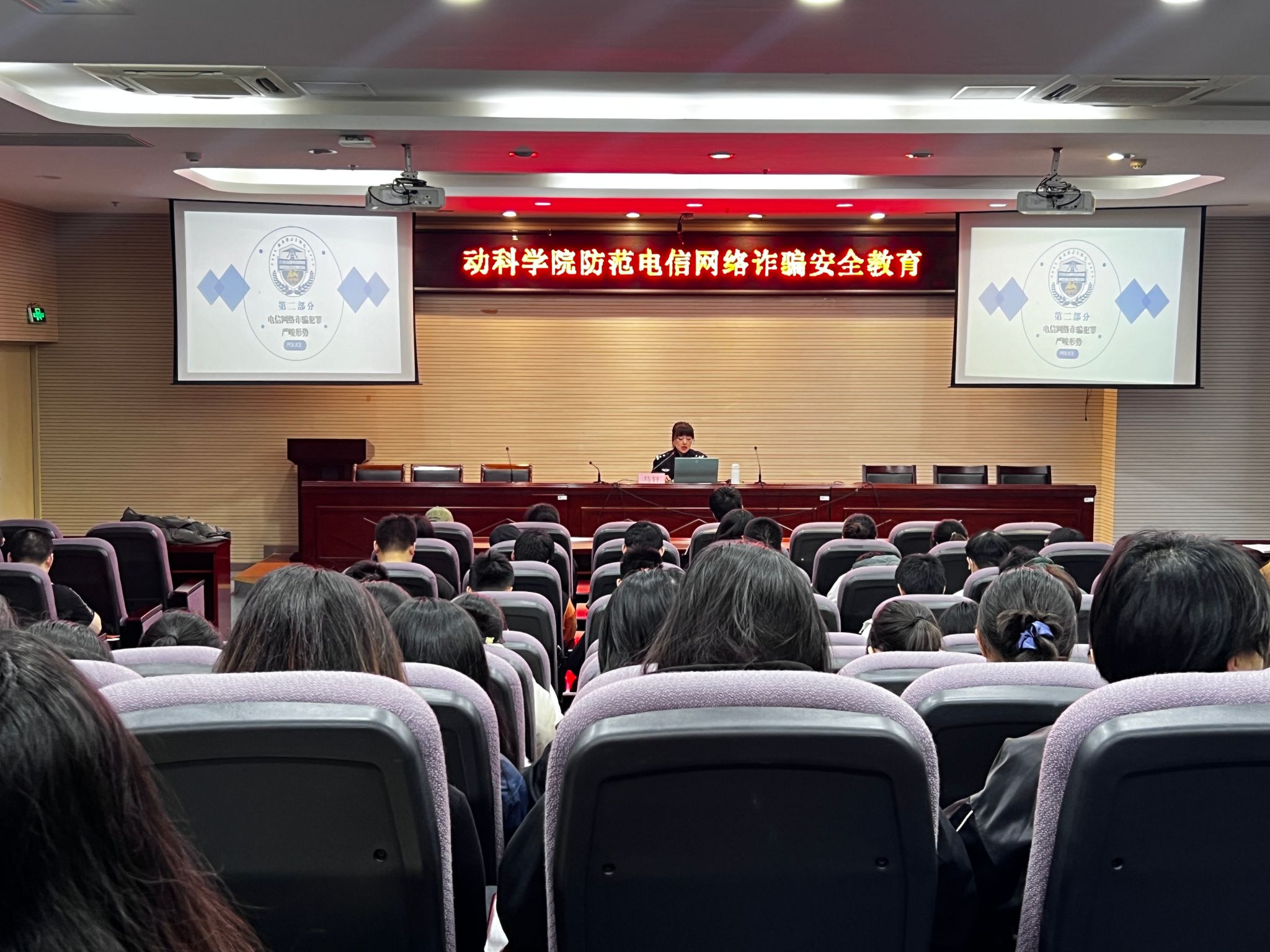 为进一步扩大反诈宣传覆盖面,预防和减少校园电信诈骗案件的发生,提高学生自我保护意识和能力,2024年4月3日下午,动科学院特邀南京市公安局反诈支队金牌宣讲员马轩警官在图书馆报告厅开展防范网络电信诈骗安全教育讲座。本次讲座由吴旖旎老师主持,学院主要学生骨干以及班级同学代表共143人参加。