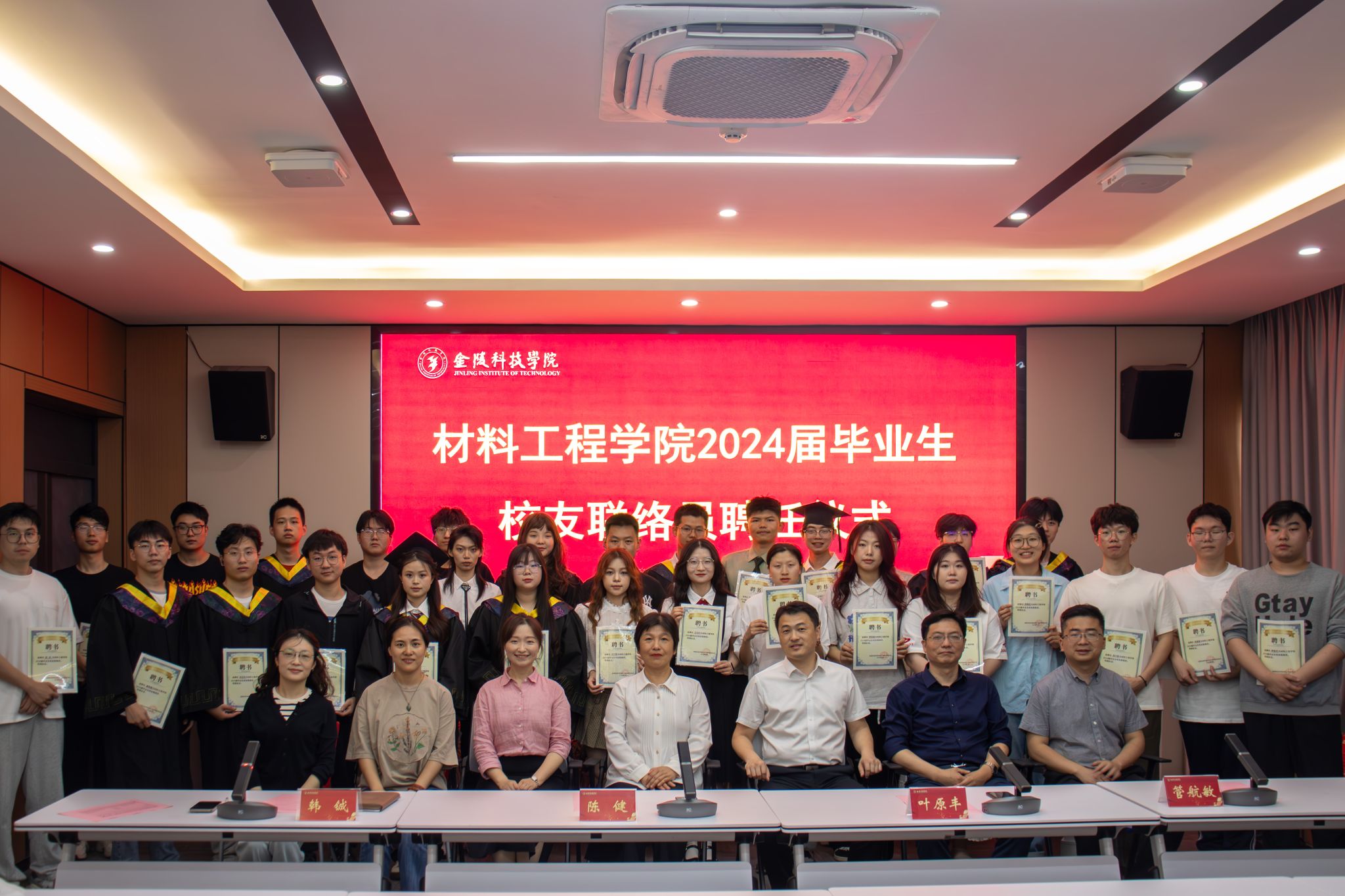 为了弘扬校友情谊,促进校友与学院之间的联络交流与合作,材料工程学院于5月21日上午,在知行楼A506隆重举行了“2024届毕业生校友联络员聘任仪式”,院党委书记陈健、院长叶原丰、党委副书记韩铖,副院长管航敏、毕业班辅导员许倩颖、邵云龙以及学院校友联络员华岚芳参会,共有三十位优秀毕业生受聘参加会议。