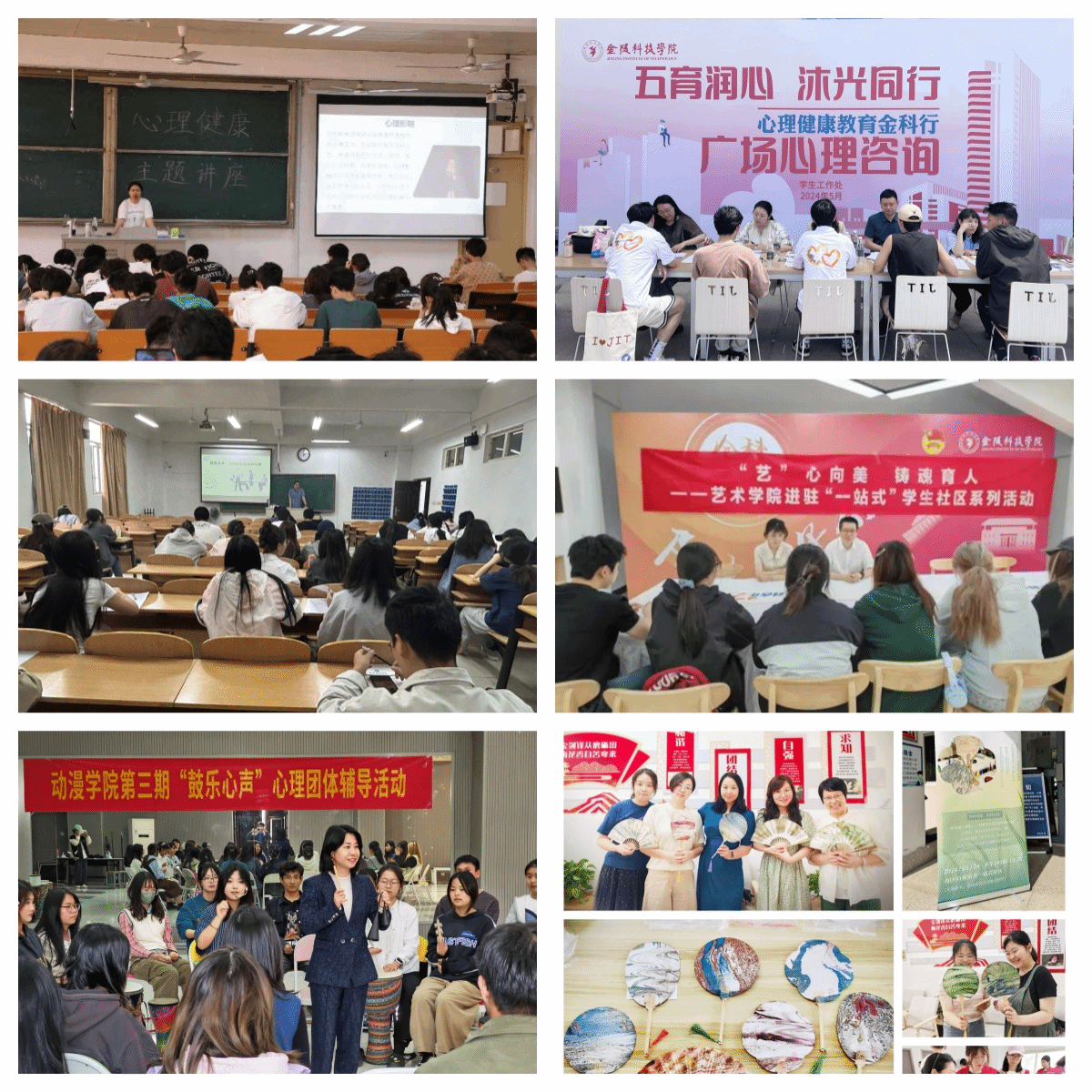 为丰富学生的校园生活,中心组织“emo了怎么办”“我的生涯,我做主---大学生职业生涯规划初探”“探索未来:大学生职业规划与发展”“把准婚恋风向标 走好精彩人生路”等4场心理健康教育主题讲座和《人际交往和沟通》《职业生涯规划——自我认知》等17场团体心理辅导;开展广场心理咨询活动、辅导员个人成长故事分享会和优秀心理委员评选活动。各学院还积极承办如“‘非遗遇夏’漆扇绒花手工DIY”“‘心韵摇荡,创思争鸣’心理文创设计大赛”“一见‘寝’心,‘寓’见美好——寝室故事大赛”“以‘种’为笔,共筑心家——种子画大赛”等全校性活动17场。“互动式+体验式+浸润式”多彩活动模式融入学生成长各个环节,丰富了学生的课余生活,增进师生情谊和同伴友谊,营造全员育心、全心育人的工作氛围,守护学生心理健康。