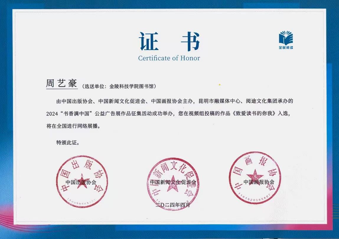 近日,书香满中国——第三届全民阅读大会公益广告展亮相云南省昆明市“十里书香长廊”,我校人文学院22数字出版2班李国安的摄影作品《阅尽图书,识遍世界》和周艺豪的视频作品《致爱书的你我》入选并展出。