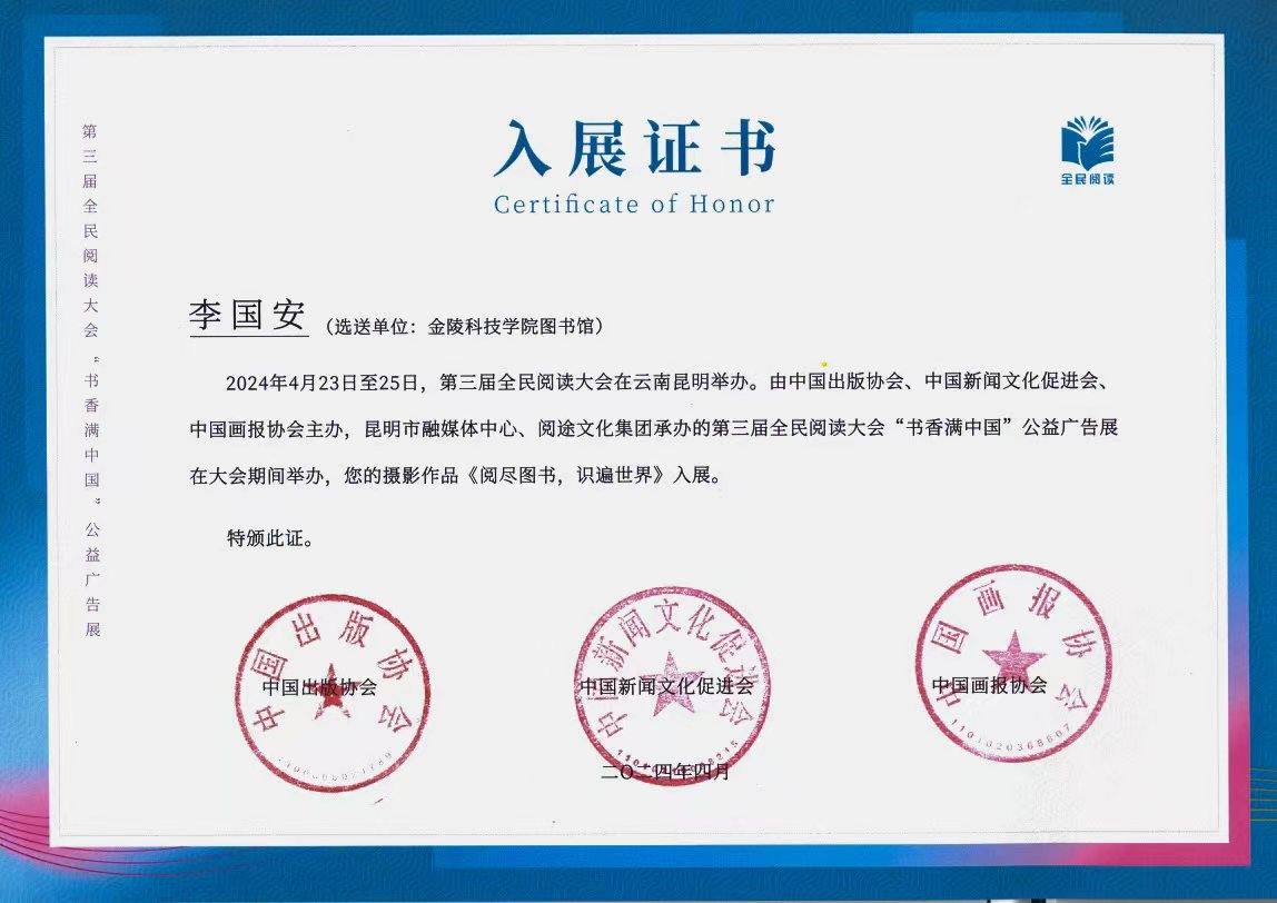 第三届全民阅读大会由中央宣传部(国家新闻出版署)、云南省委、云南省人民政府共同主办,中央宣传部出版局、云南省委宣传部、昆明市委、昆明市人民政府承办,大会以“共建书香社会 共享现代文明”为主题。作为大会的重要组成部分,由中国出版协会、中国新闻文化促进会、中国画报协会主办,昆明市融媒体中心、阅途文化集团承办的第三届全民阅读大会公益广告展在海埂会堂及“十里书香长廊”展出,入展作品兼具阅读风尚与艺术美学,具有极高的传播价值,更以独特的视角和形式,让人们深刻感受到阅读的广度与深度。我校图书馆积极组织学生参赛,提交了多幅优秀作品,为营造“爱读书、读好书、善读书”的良好氛围和提升公众对阅读价值的理解发挥了积极作用。