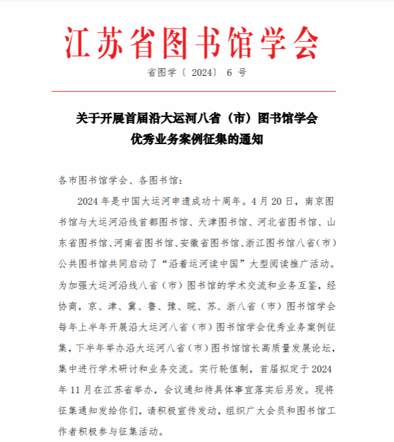 本次活动由江苏省图书馆学会承办,旨在通过征集优秀案例,加强沿大运河八省(市)图书馆界的学术交流和业务互鉴,共同提升图书馆建设水平。本次征集活动得到了相关省市公共图书馆和高校图书馆的积极参与,其中江苏省共收到申报案例97个。经专家评审委员会初审、复审和终审,从“创新性”“实践性”“应用价值”和“材料准备”四个方面综合考量,评选出一等奖10个、二等奖15个、三等奖20个。