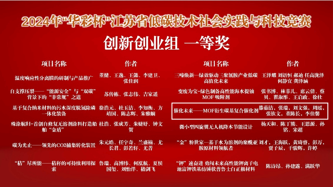 本次比赛共66件入围决赛的作品,经项目汇报、评委答辩、专家打分等环节,开云在线材料工程学院赵媛、王昭、林青老师指导,功能材料专业滕茹洁、张瑞、刘文强等同学主持参加的《催化未来—MOF衍生碳基复合催化剂》项目荣获一等奖的好成绩。