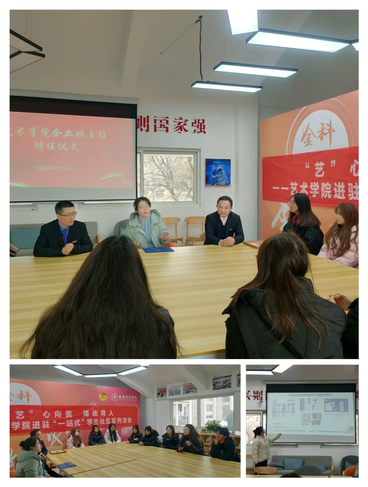 开馆仪式后,陈林和24级服装与服饰设计2班学生代表、学院学生骨干在南08一站式社区开展座谈。匡才远,鲍锐,辅导员陈烨、刘思思出席活动。座谈会由鲍锐主持。匡才远向陈林颁发企业班主任聘任证书。他指出,聘请优秀校友担任企业班主任,是学校在“家校社协同育人”背景下积极探索校友共育人才的创新举措,能够切实帮助学生进一步认识专业、爱上专业、学好专业。陈林回顾了自己在艺术学院学习和参与非遗传承与保护工作的经历,特别是“非遗”传承的种子如何通过老师的言传身教在自己的心里扎下了根,也在自己的职业生涯中扎下了根。她希望同学们以设计承载弘扬优秀传统文化,让“非遗”文化的种子历经时间洗礼,发芽开花,学“艺”致用,成为大国工匠。22级学生景文楠讲述了和团队成员申报大学生创新训练计划项目,投身到乡村振兴战略背景下的基于云南非遗南华彝绣的校园文创产品的创新路径研究的火热实践;23级学生林敬宜讲述了自己从小师从金陵非遗剪纸大师张方林,用一刀一纸讲述千年风华的守正与创新的故事,并作为学生代表向陈林赠予了其亲手创作的以金科院为主题的剪纸作品。鲍锐作总结讲话,他指出,艺术学院将继续以“艺”心尚美,铸魂育人为宗旨,立足学科特点、专业特色和学生特质,组织专任教师、优秀校友、辅导员等多支育人队伍下沉社区,全员呵护学生成长,汇聚起育人的强大合力。