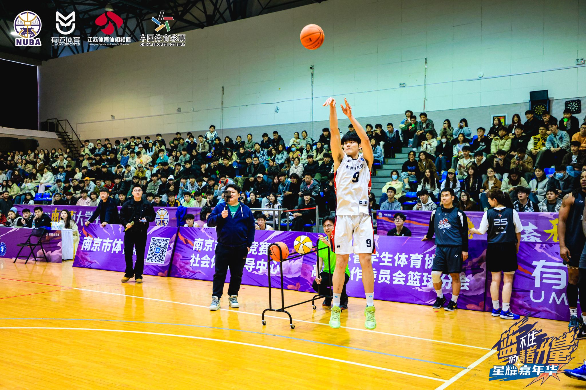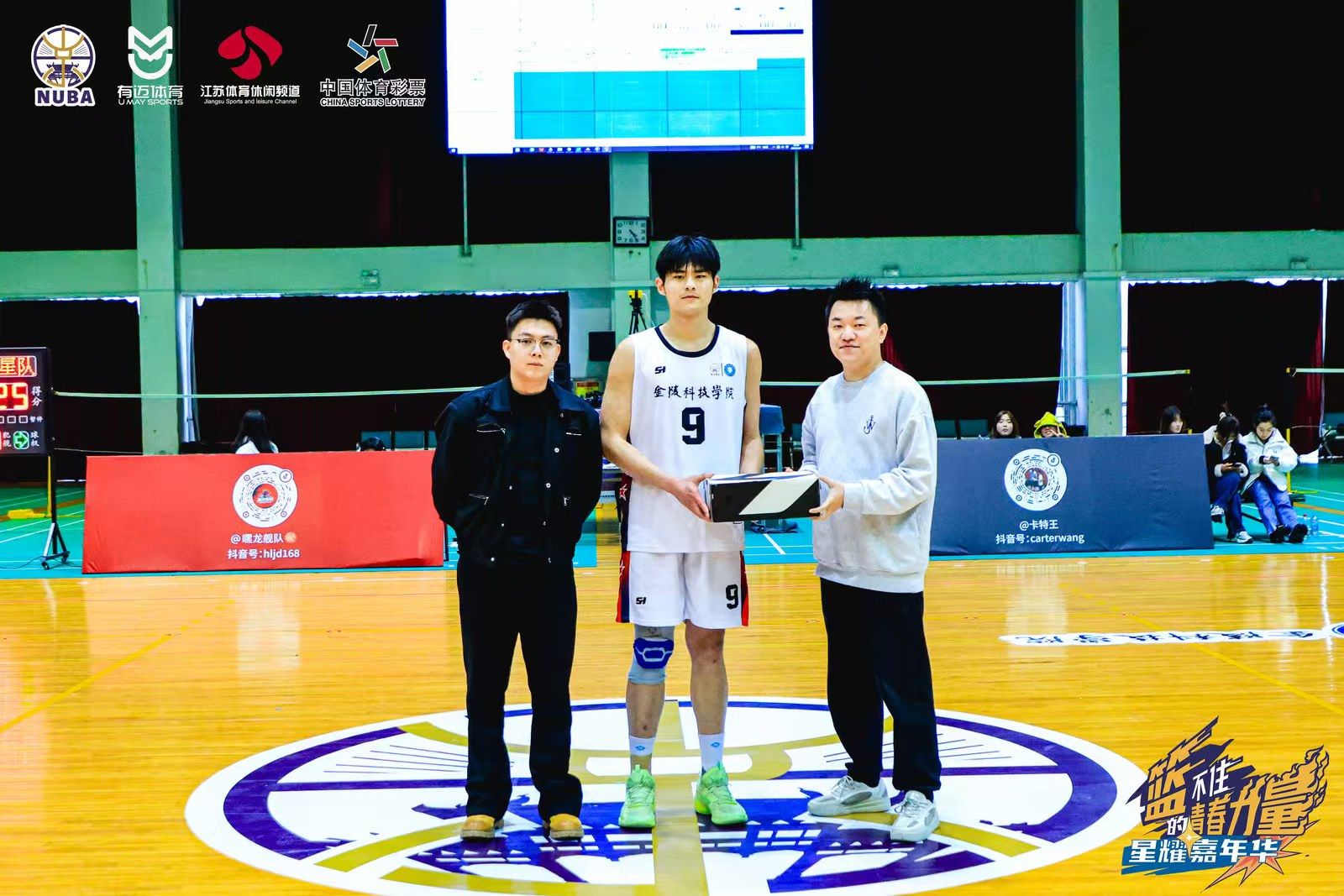 3月9日,开云在线体育馆上演了一场精彩绝伦的篮球盛会——NUBA星耀嘉年华。本次嘉年华活动内容丰富多样,设有三分球大战、1v1比拼以及明星球队对抗赛等精彩项目。我校男篮队员黄泳镜凭借中场超远三分拿下三分球大赛的冠军并获得卡特王赠送的精美球鞋一双。
