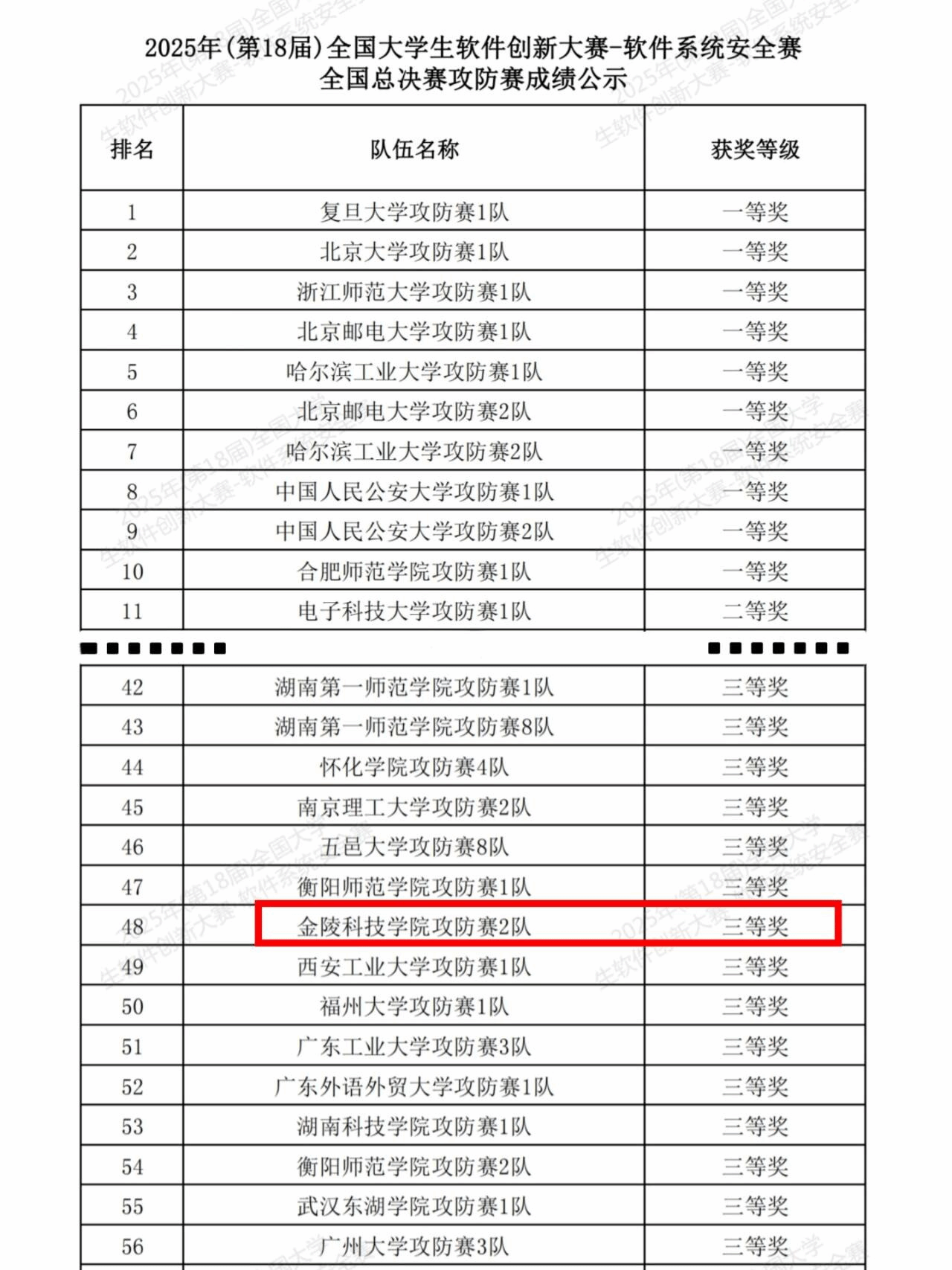 5月17日至18日,2025年(第十八届)全国大学生软件创新大赛——软件系统安全赛全国总决赛(攻防赛)在湖南大学举行,金陵科技学院网络安全学院的“Dozer战队”凭借扎实的技术功底与创新实践能力,荣获攻防赛三等奖(公示序号48),这是该队在华东区域赛中斩获一等奖并成功晋级总决赛后的又一突破。